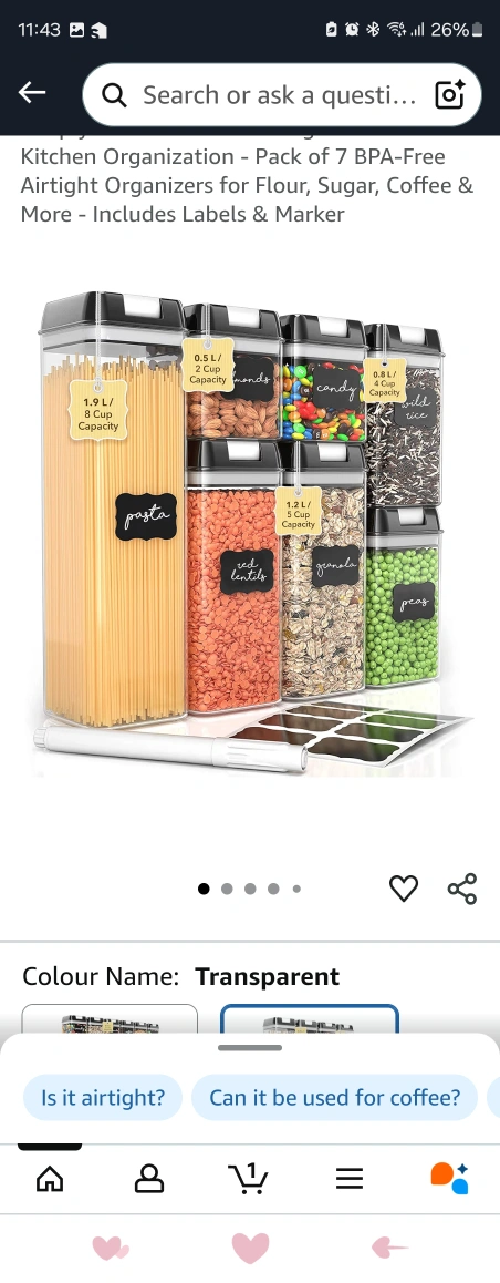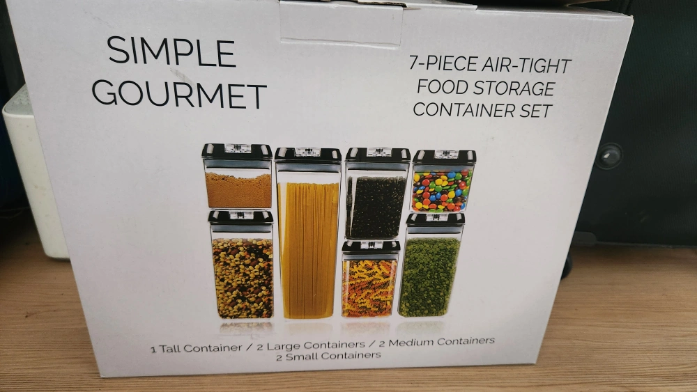 10Keep your pantry organized with this Simple GourmeBrand new, 7-piece air-tight food storage container set! It includes 1 tall container, 2 large containers, and 2 medium containers. Perfect for storing flour, sugar, coffee, pasta, lentils, granola, peas, and more