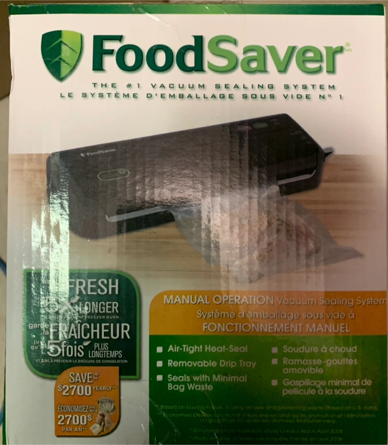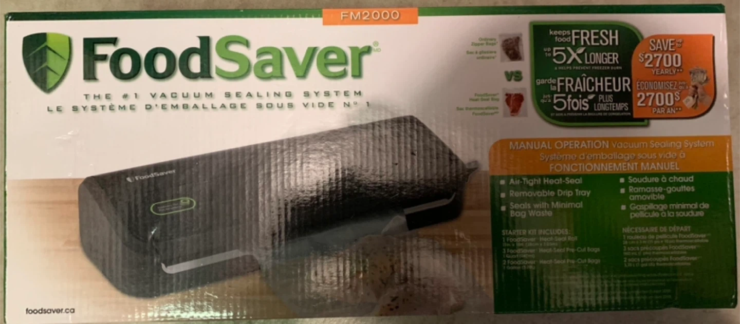 103Brand New. Keep your food fresh longer with the FoodSaver FM2000! This vacuum sealing system is designed to keep food fresh up to 5 times longer. The box includes the FoodSaver, a removable drip tray, and starter kit bags. Save up to $2700 yearly! Retail at Walmart is $98.99