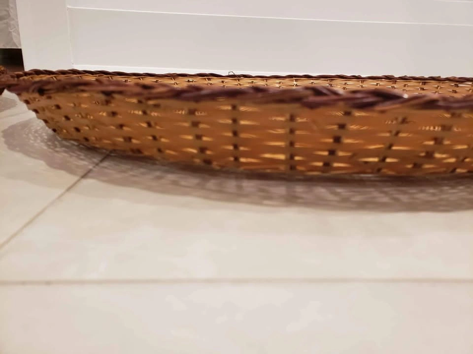 Two matching round wicker trays. Light brown wicker with a darker brown woven border. Perfect for serving or display. Diameter approximately 19 inches handle to handle.