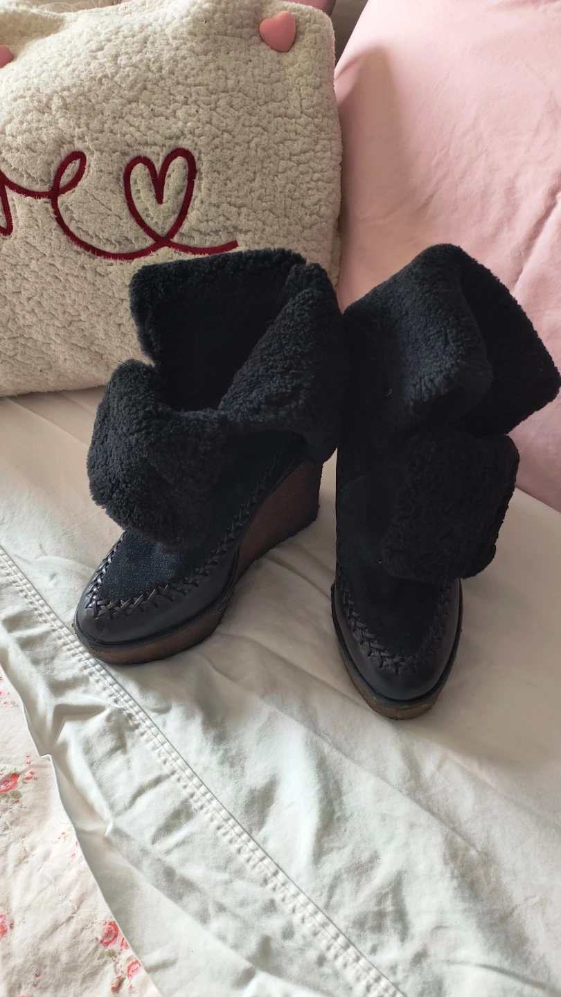 SHOE CULT by Jeffrey Campbell wedge coach boots in black. Made with suede and faux fur lining. Aldo open toe leather Features a wooden wedge heel and decorative stitching. Perfect for adding some flair to your outfit!
