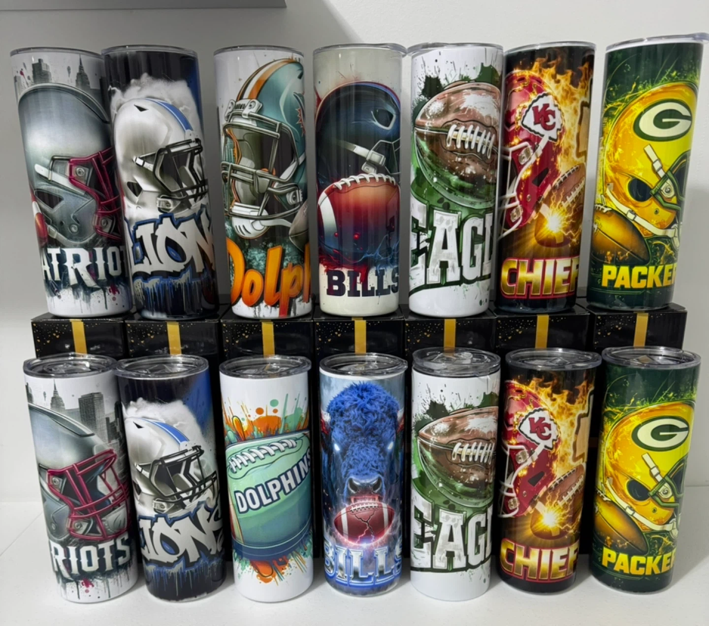 19I have a selection of NFL team tumblers for sale! Represent your favourite team with these stylish tumblers. Teams include the Patriots, Lions, Dolphins, Bills, Eagles, Chiefs, and Packers. Perfect for showing off your team spirit!