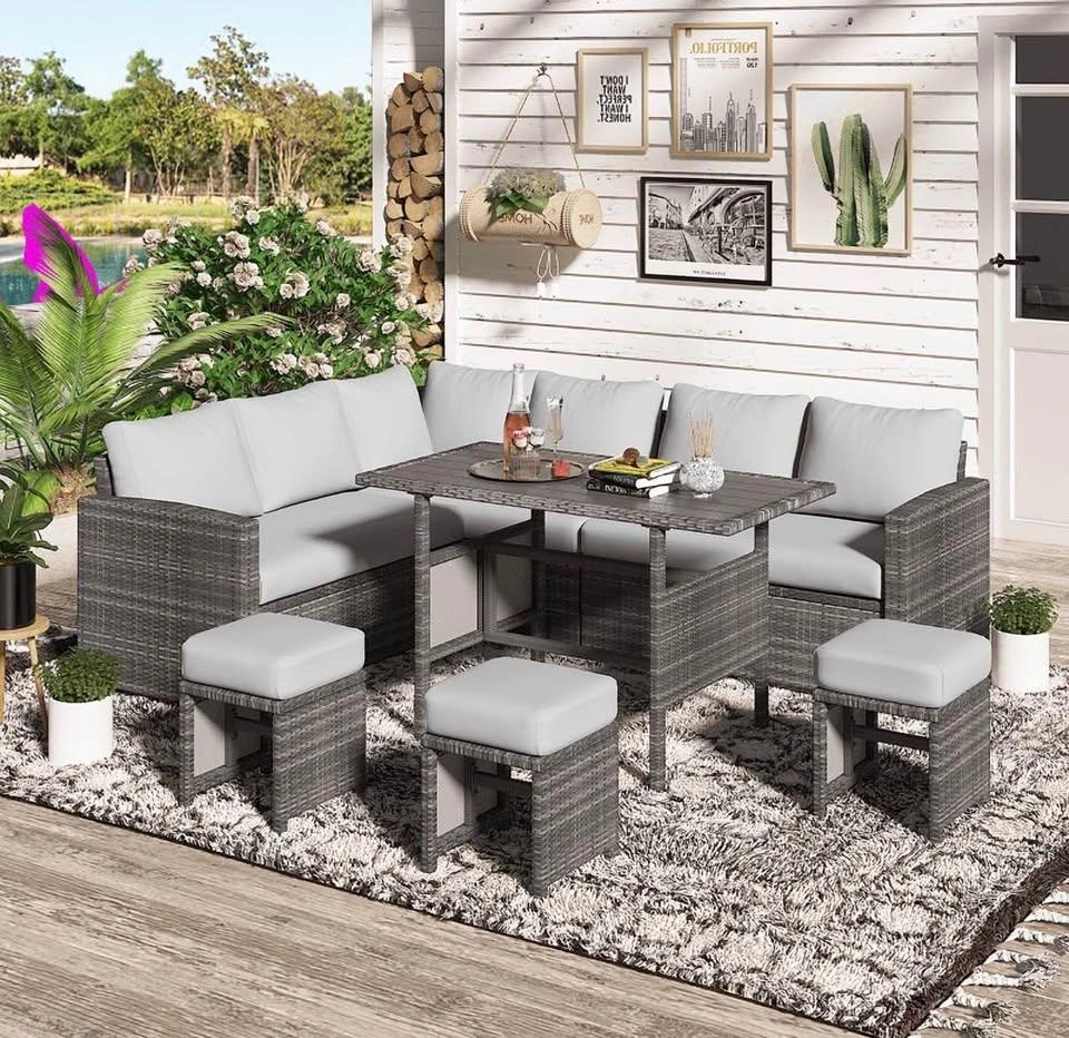 Perfect for backyard, patio, or terrace modern design with light grey cushions that match any outdoor space.