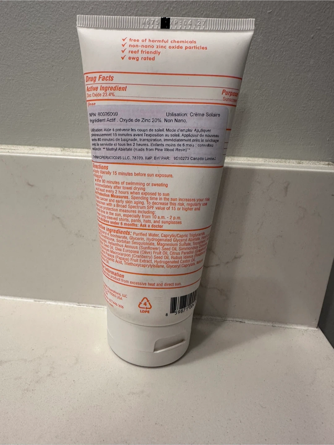 Brand new Thinkbaby SPF 50 sunscreen, 177ml. Broad spectrum UVA/UVB protection. Water resistant for 80 minutes. Free of harmful chemicals and non-nano zinc oxide particles. Reef friendly and EWG rated. Expiry April 2027.