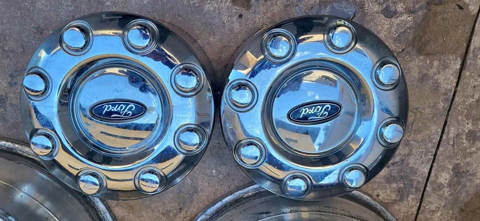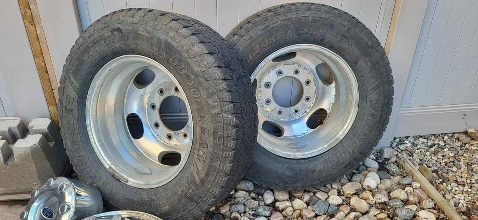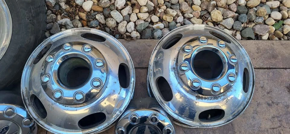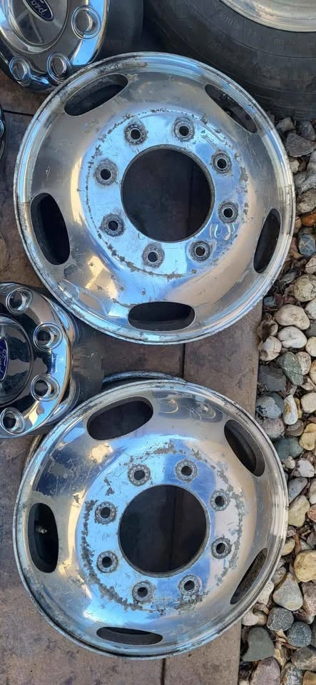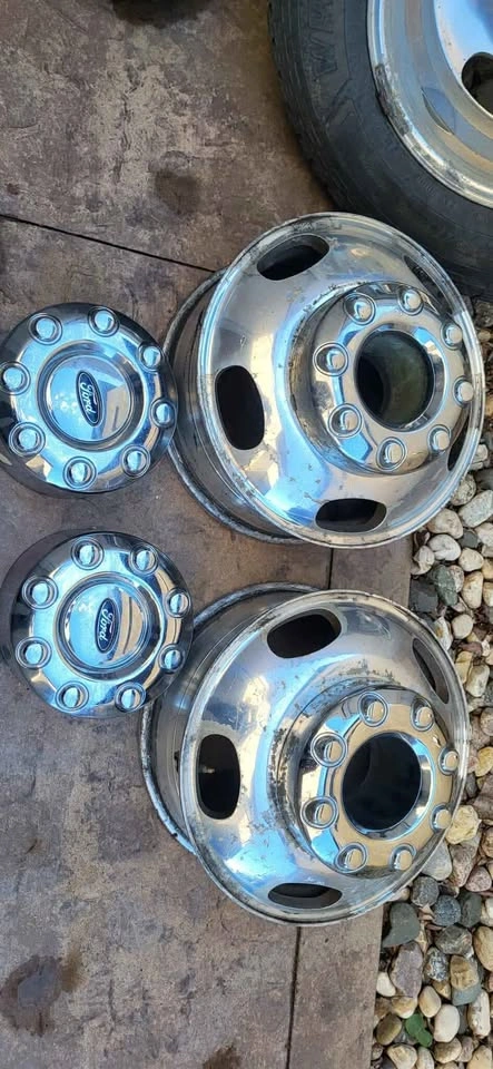 Factory 2017 Platinum F-350 Dually Polished Aluminum Rims and Caps (OEM). Will not separate. Four rims and four caps. Rear tires included. Slight slotting of front wheel lug holes. Sold in as is condition.