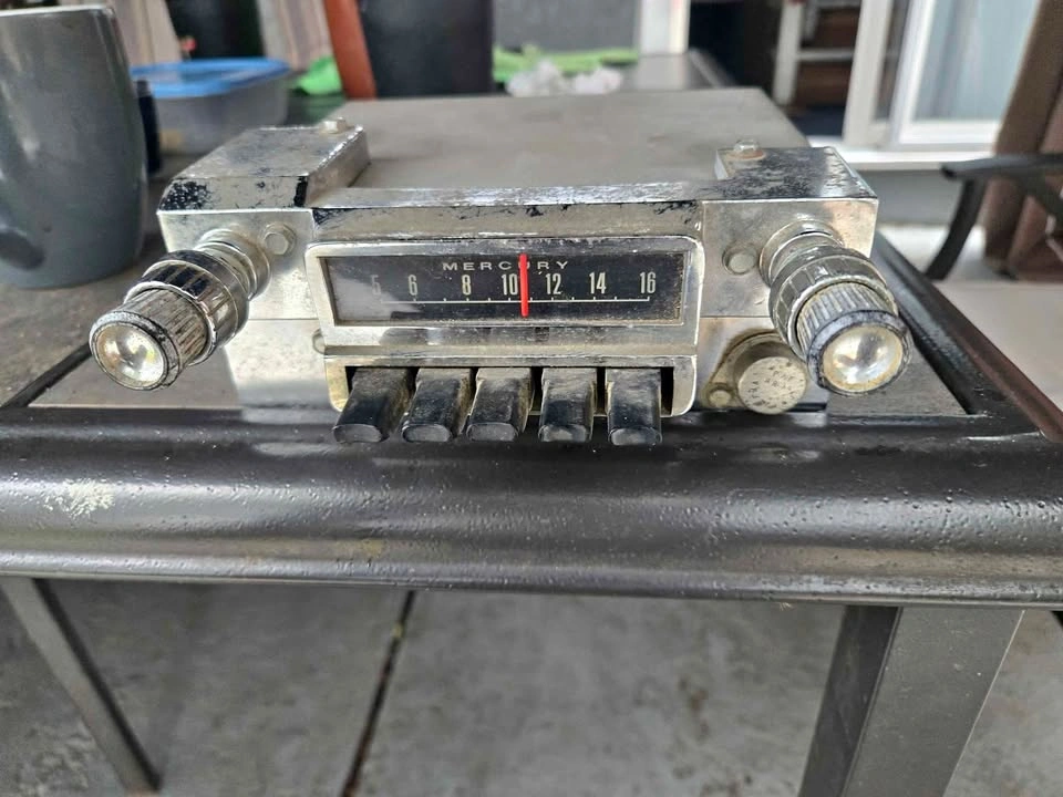 This is a vintage Ford Mercury car radio. It is in used condition, with some signs of wear consistent with its age. It has knobs, buttons, and wiring. Perfect for restoring a classic car to its original condition. While I don't have specific specifications for this radio, here are some general details based on similar models: * Brand: Ford / Mercury * Era: 1960s * Type: AM Radio * Features: Push-button tuning * Voltage: 12V Given its age and rarity, I estimate the value to be around $150.00 CAD. This is based on similar vintage car radios listed on Kijiji. Just a friendly heads-up: if you're seeing this ad, the radio is still up for grabs!