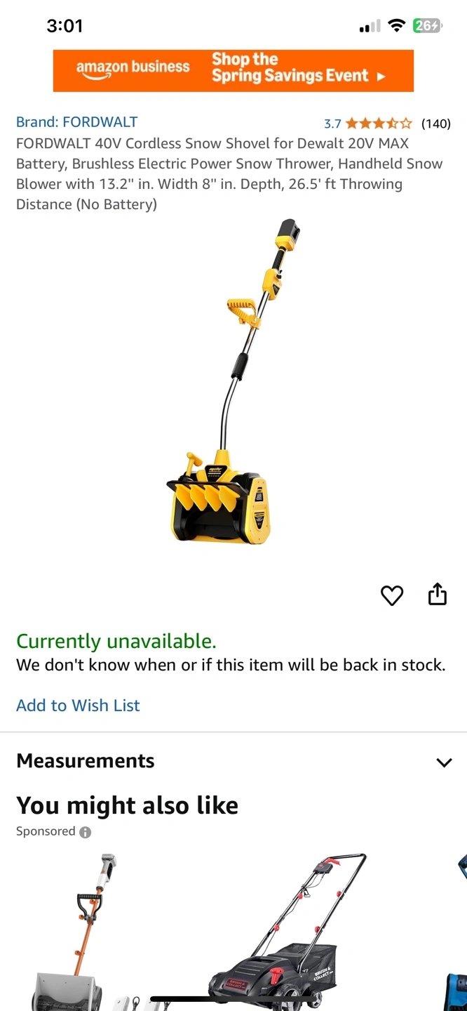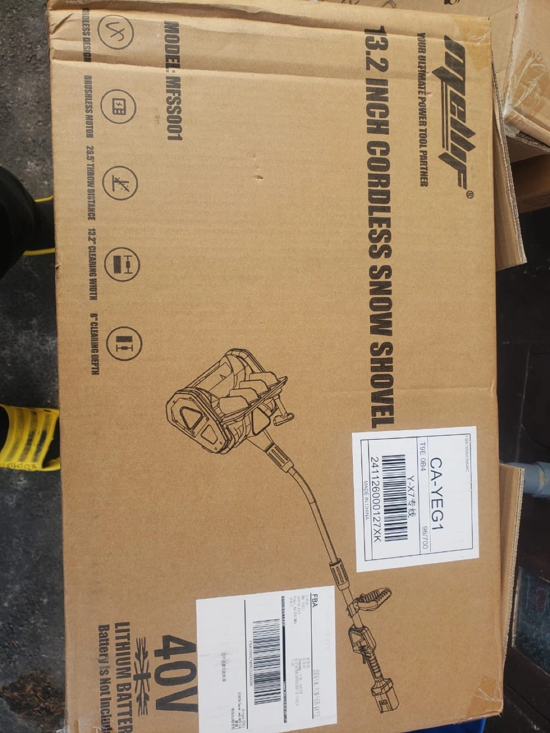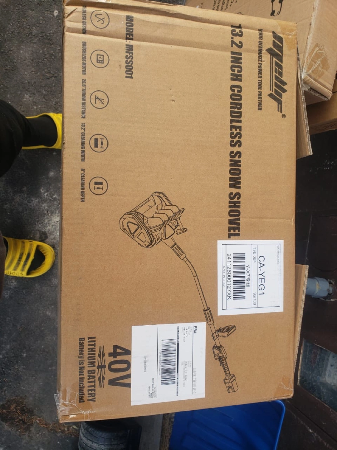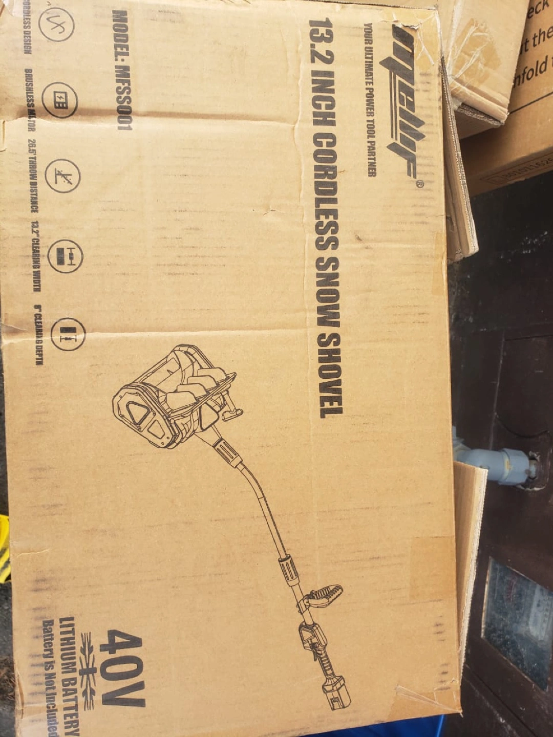 142Brand new, in box. 13.2 inch cordless snow shovel. . Brushless motor. 26.5 ft throwing distance. 8" clearing width. 7" clearing depth. It requires 40V lithium battery. Battery not included.