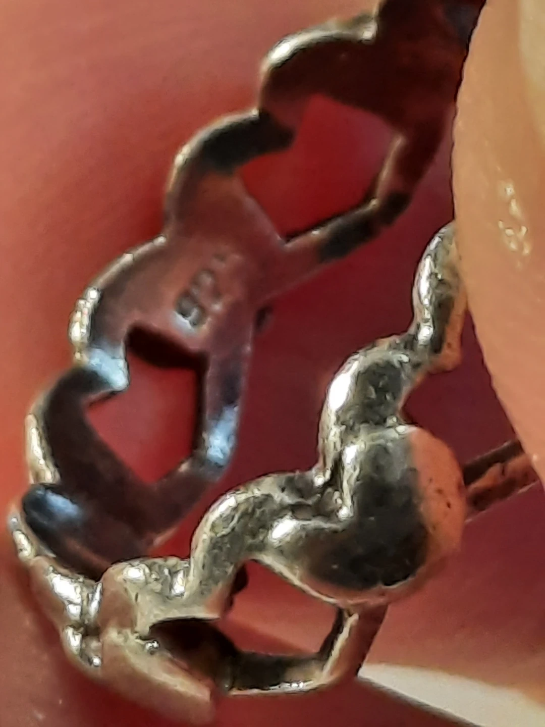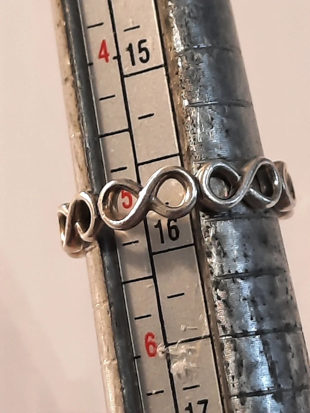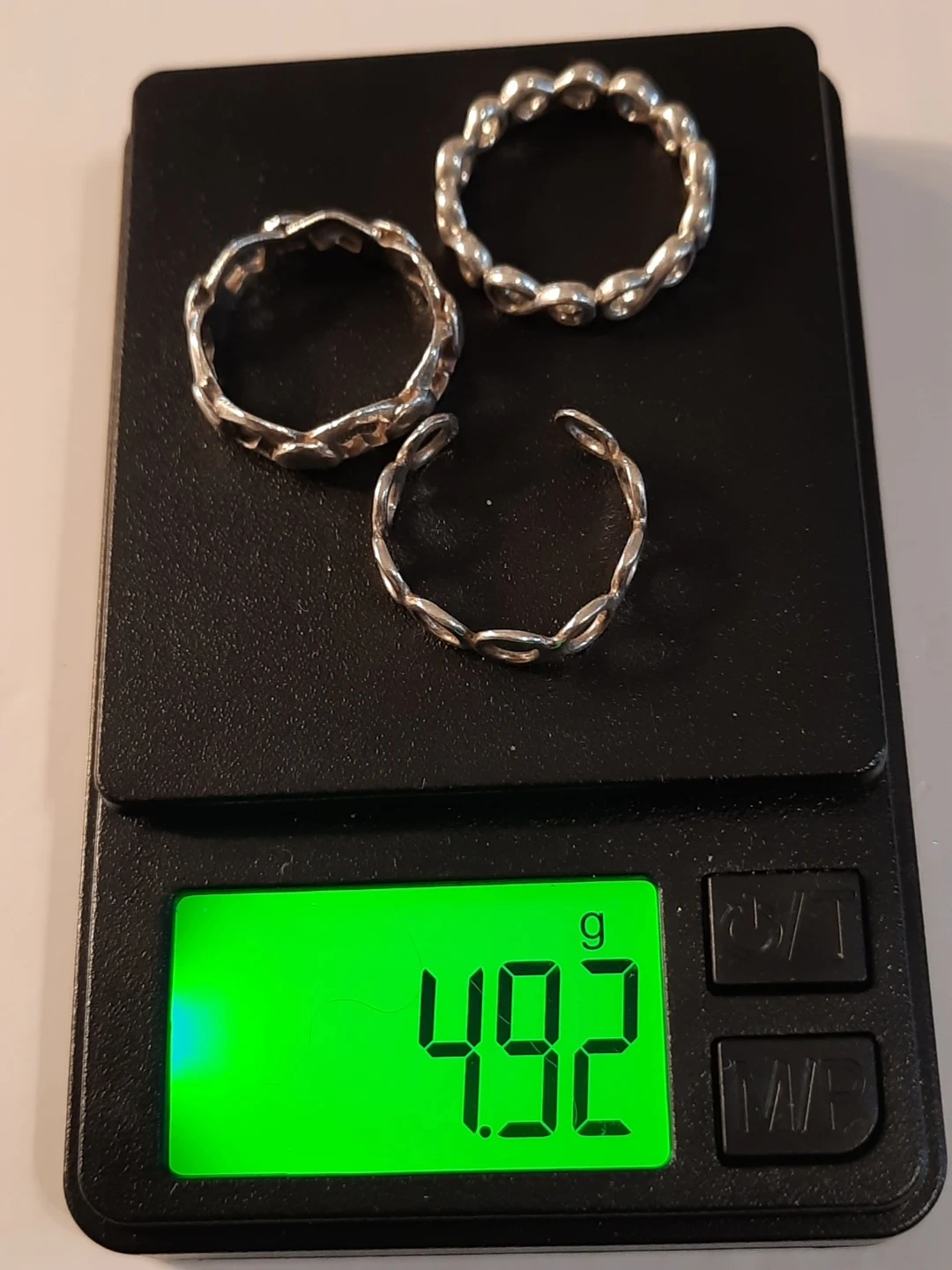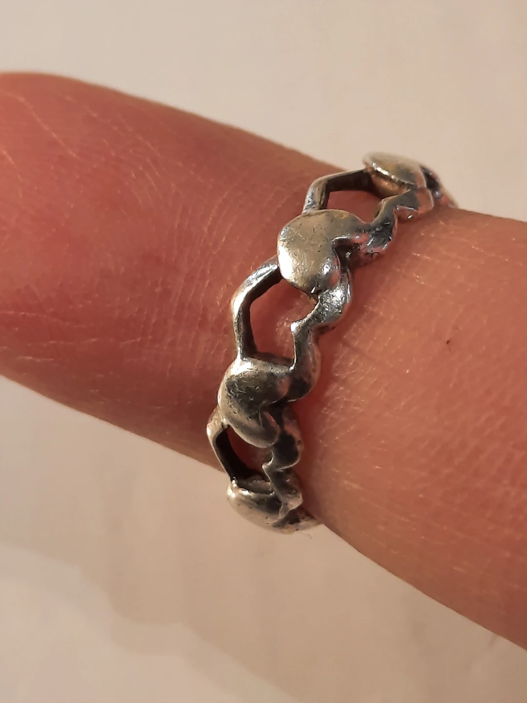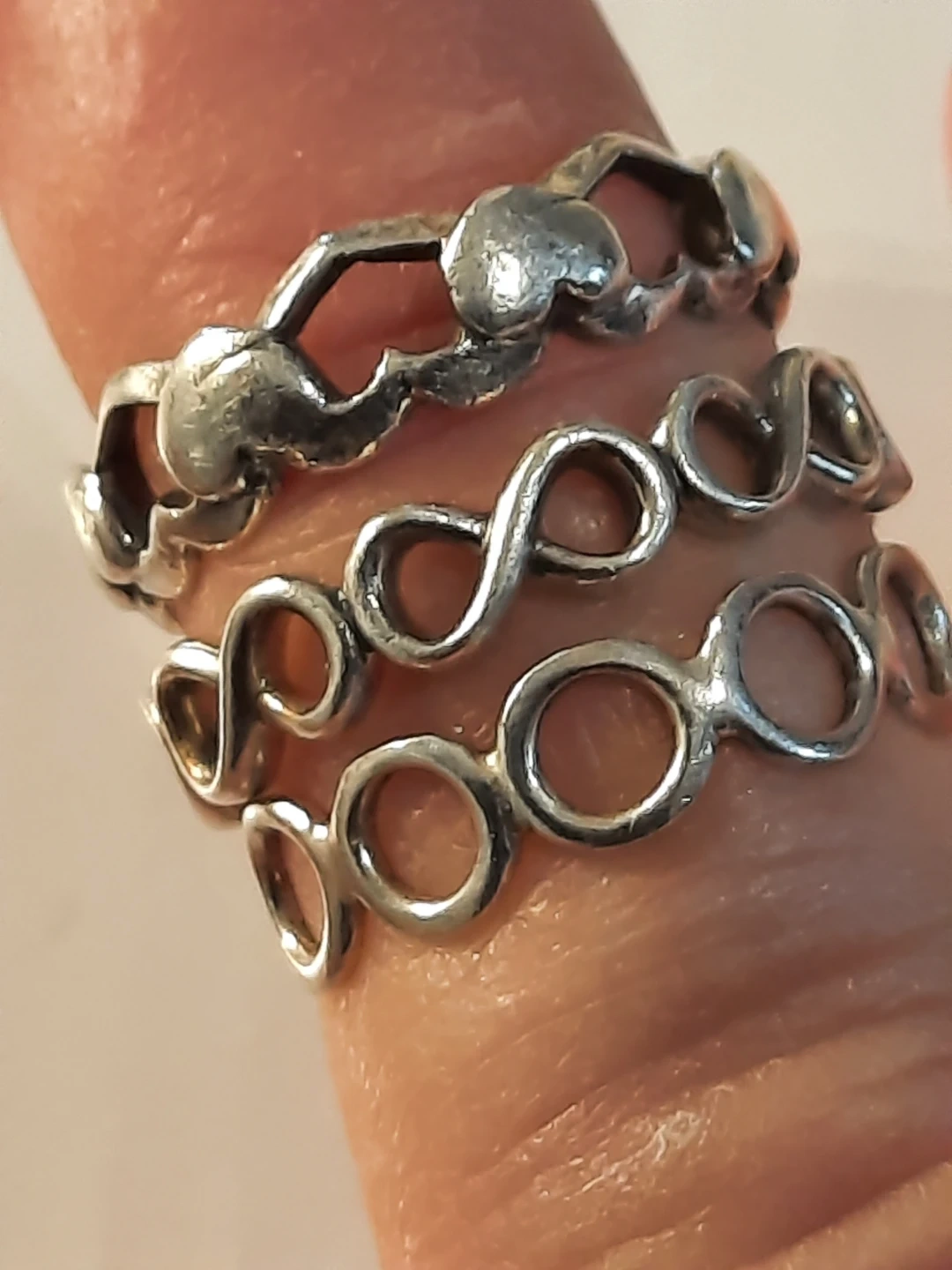 Set of three sterling silver rings,one from Pandora. Stamped Ale 925.Includes two bands with linked ovals and one adjustable band with a similar design. Stamped S925 ALE.3 in total.to match.