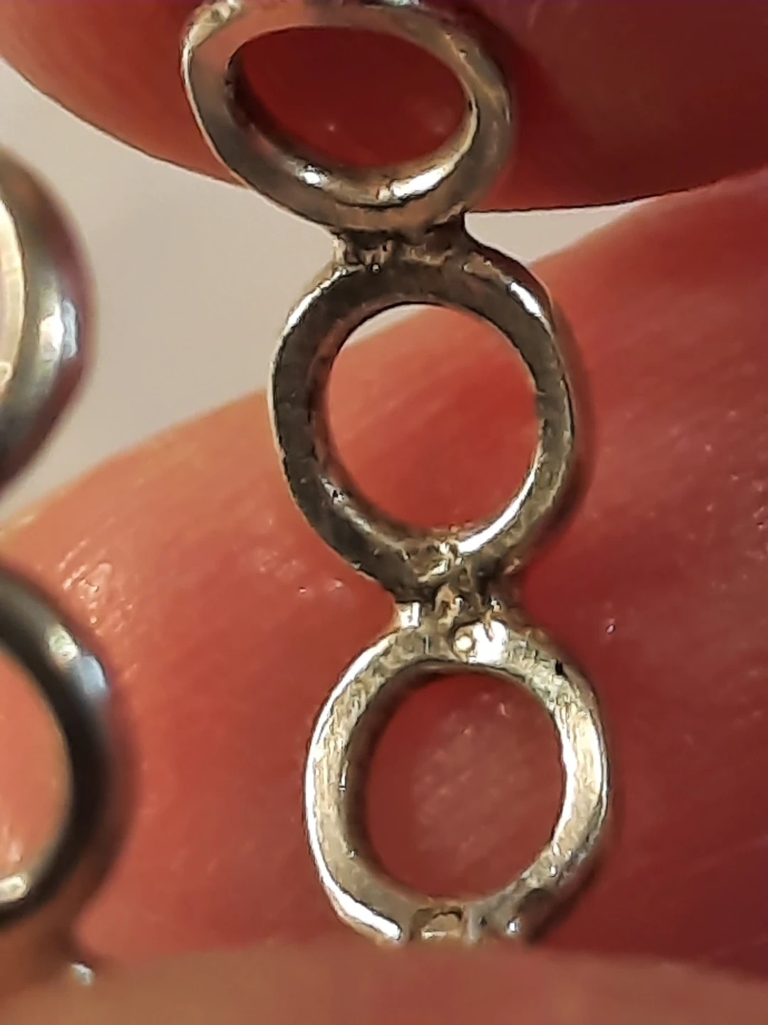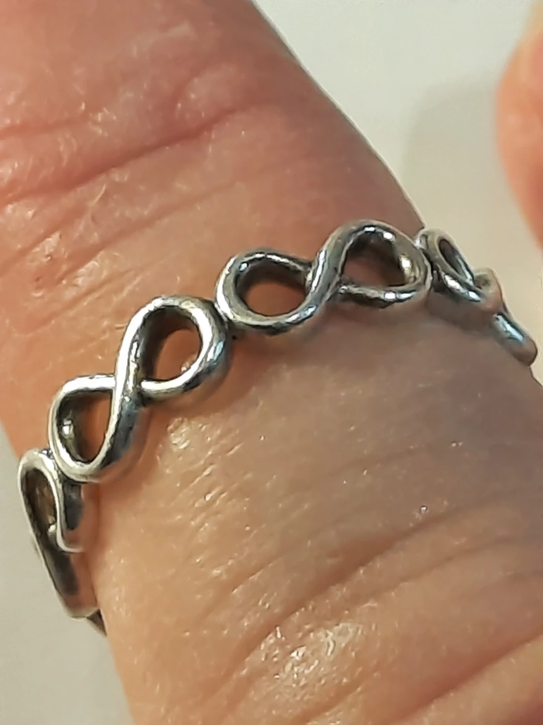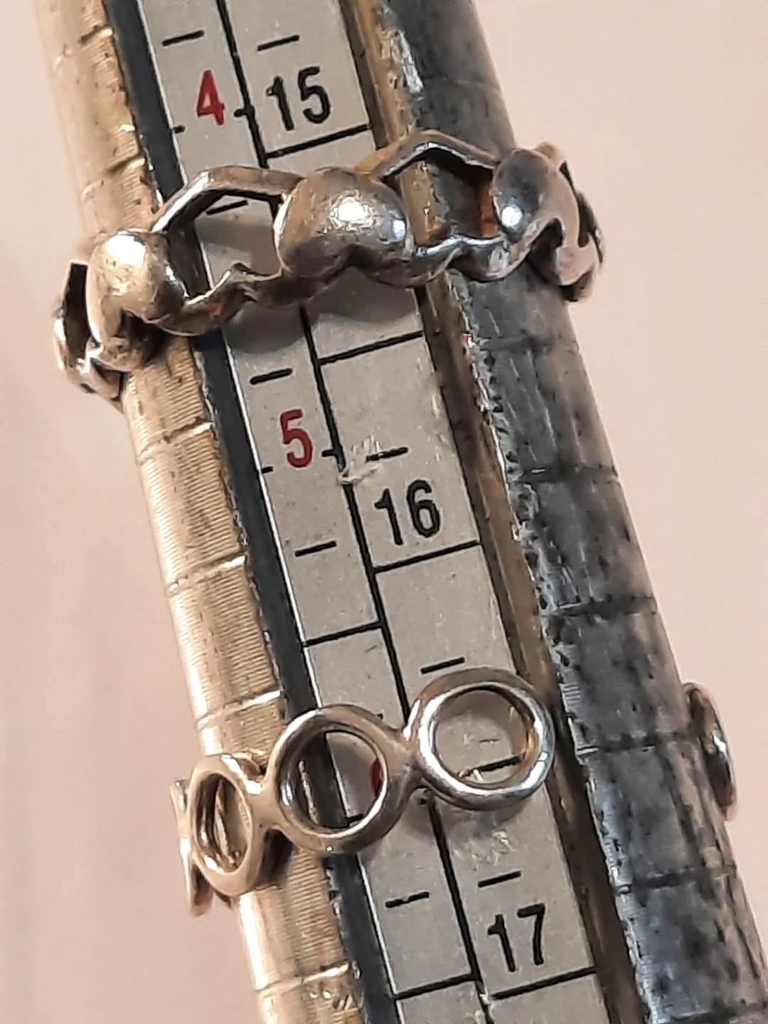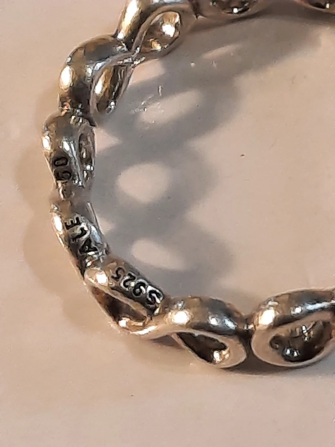 Set of three sterling silver rings,one from Pandora. Stamped Ale 925.Includes two bands with linked ovals and one adjustable band with a similar design. Stamped S925 ALE.3 in total.to match.