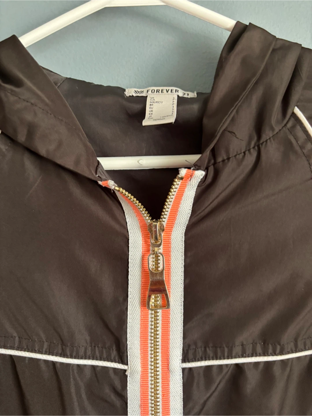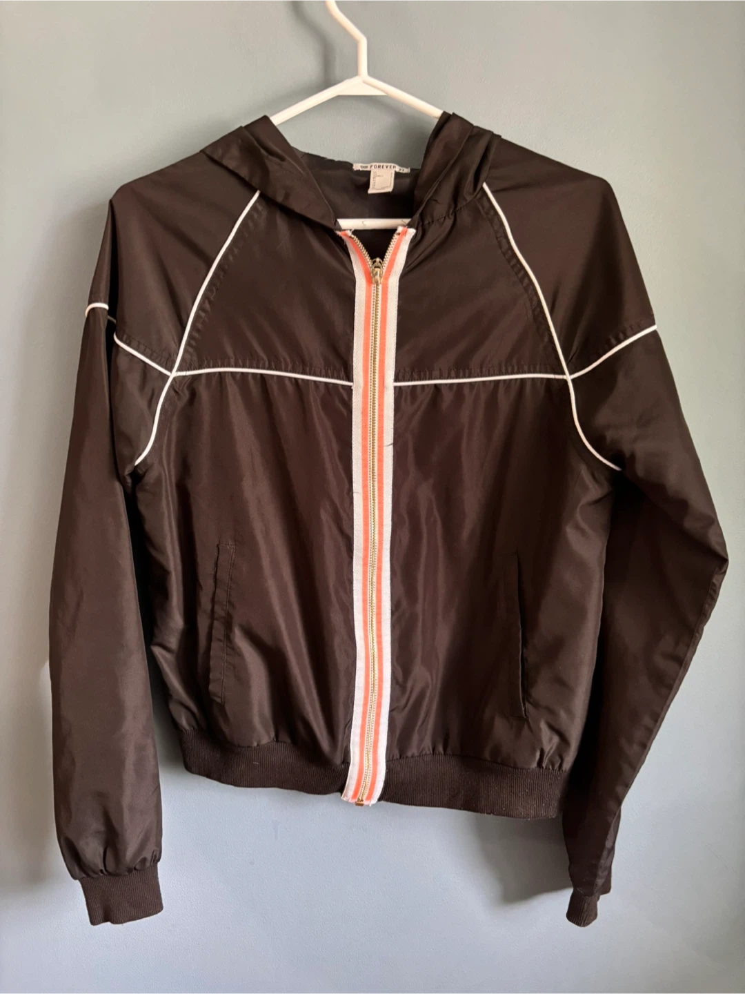 Selling a cute Forever 21 hooded jacket in a black colour! It's a size small and features a stylish design with a zipper and white accents. Great for layering or wearing on its own
