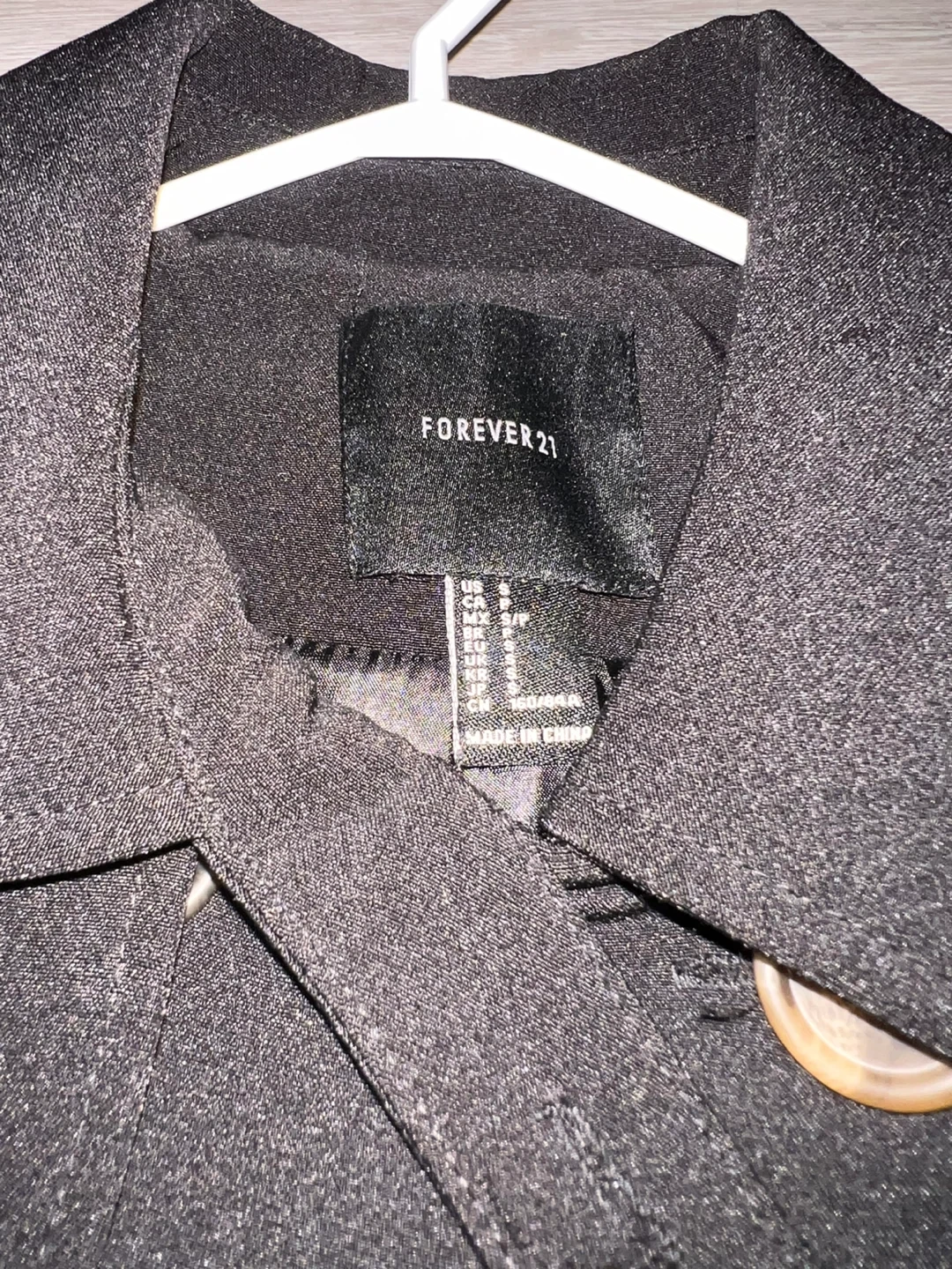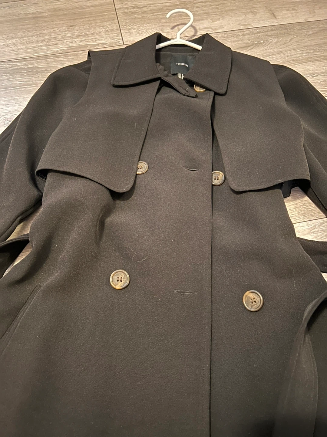 52Selling a black color brand is Forever 21 trench coat in size small. It's in great condition and features a classic design with a belted waist. Perfect for layering and adding a touch of style to any outfit! Worn about 10 times. No holes good condition!