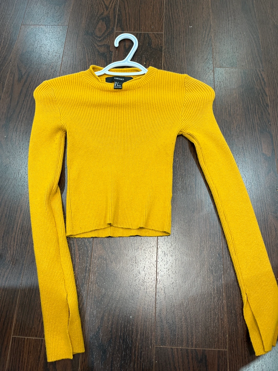 Long sleeve cropped sweater. Mustard yellow colour. Ribbed knit fabric. Size small. Split cuffs.
