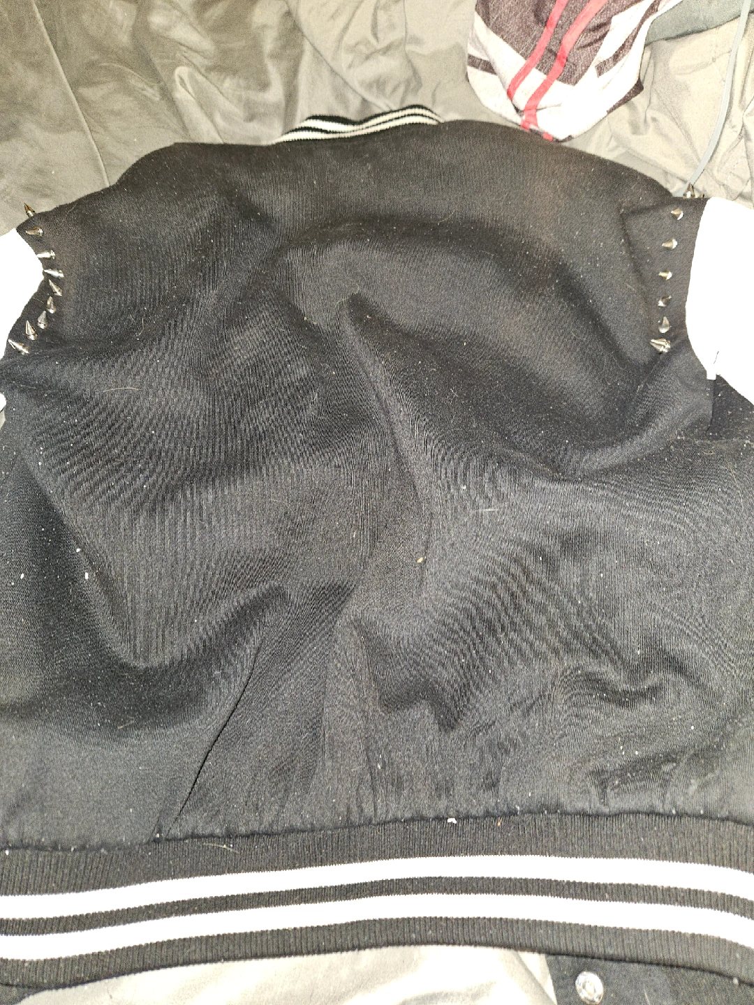108Selling a Forever 21 varsity jacket in size small. It's black with white sleeves and has some signs of wear from being put in the dryer, as shown in the pictures. Still lots of life left in it! Comes from smoke-free, cat-friendly home.
