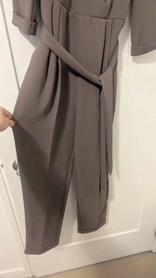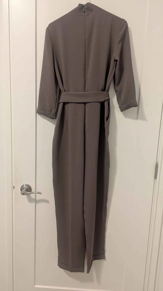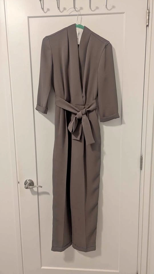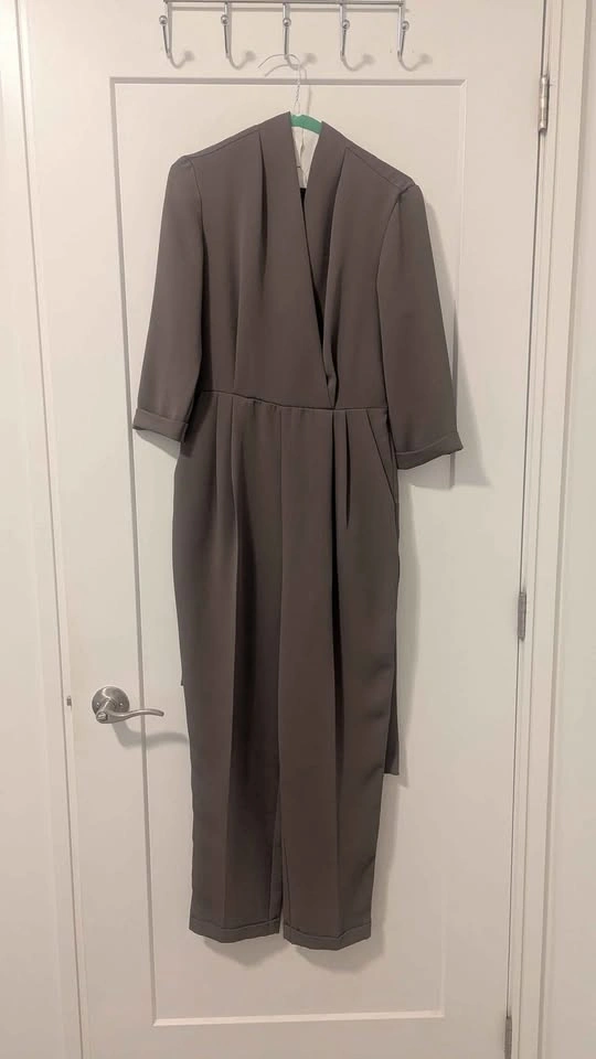 Full jumpsuit in Olive Green from Le Chateau. Only worn once and was immediately dry cleaned so it is in great condition. Original price $129. Size: XS but runs large and would definitely fit someone who normally wears a S. Looks baggy but is much more flattering on. Has a fabric belt that can be tied or removed.