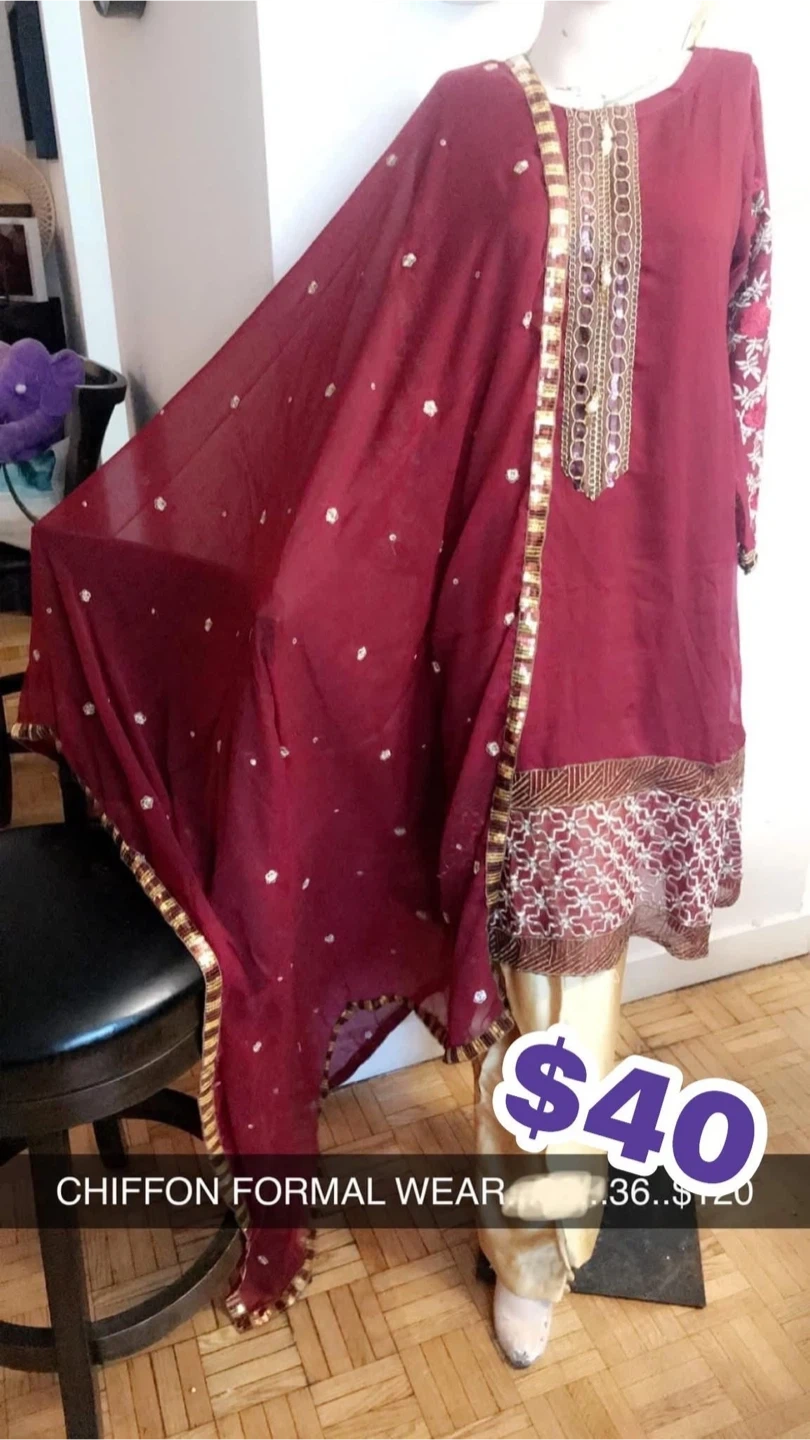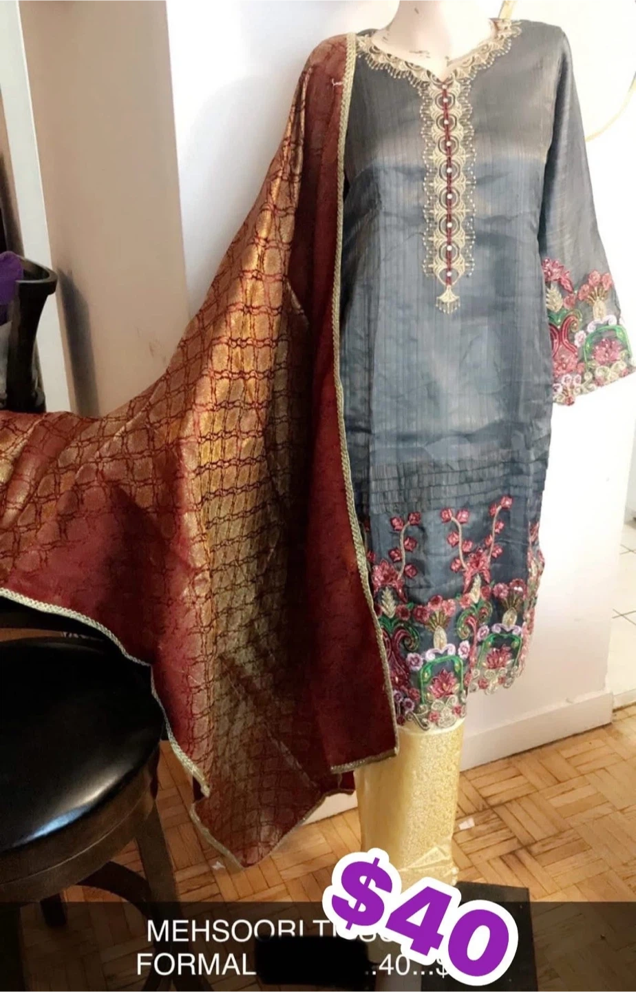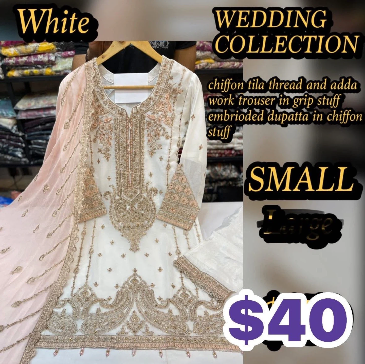 25Selling a beautiful formal wedding collection dress! It features intricate chiffon tila thread and adda work, with a trouser in grip stuff and an embroidered dupatta in chiffon stuff. Size small and in great condition!
