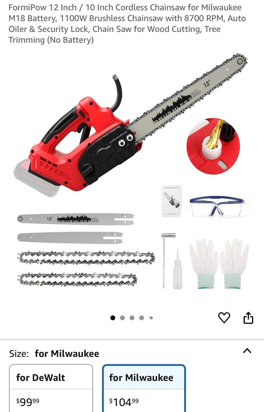 I'm selling a FormiPow 12 Inch / 10 Inch Cordless Chainsaw. It's compatible with the Milwaukee M18 Battery. It has a 1100W Brushless Chainsaw with 8700 RPM, Auto Oiler & Security Lock. Great for wood cutting and tree trimming. Battery is NOT included