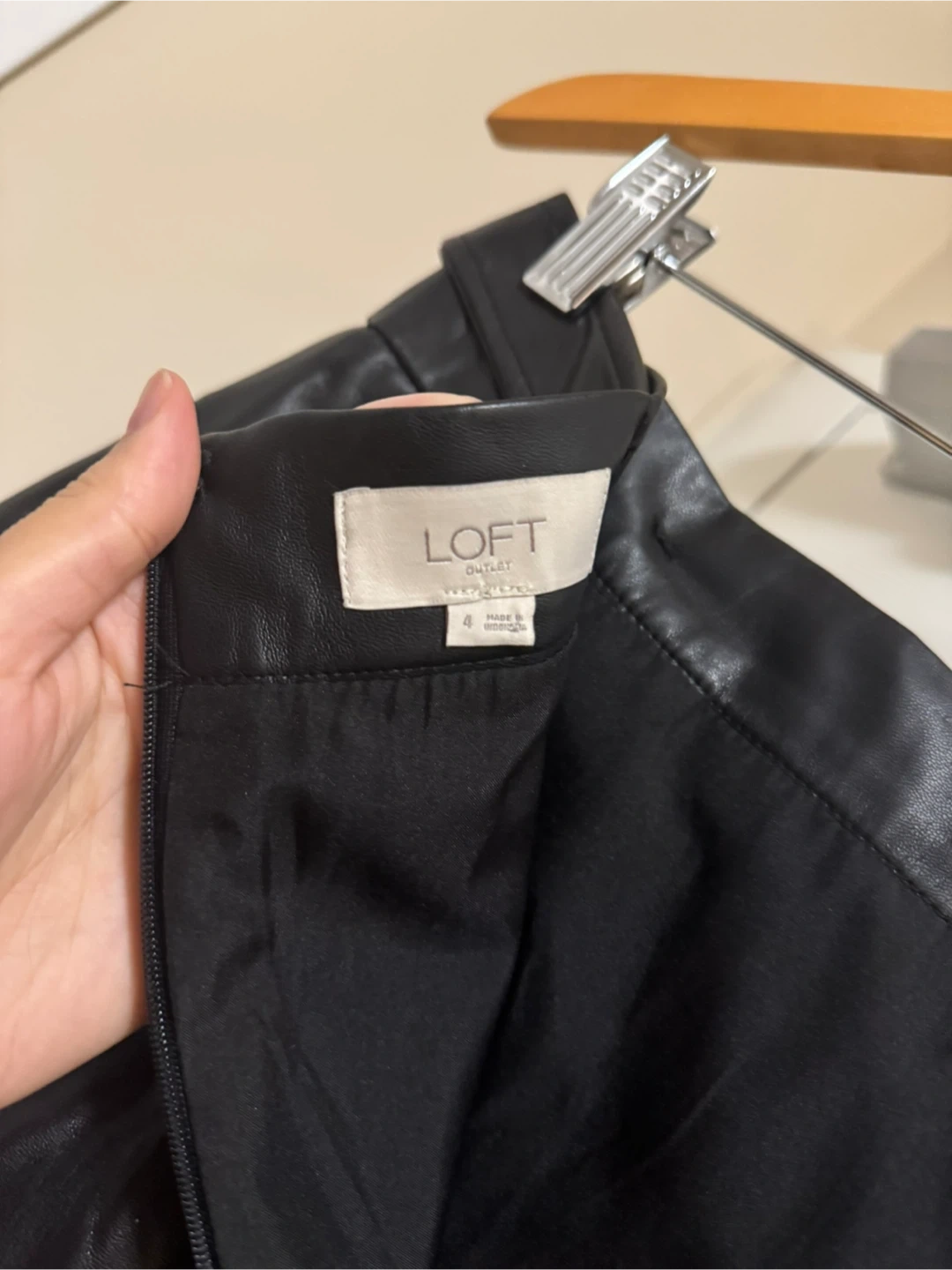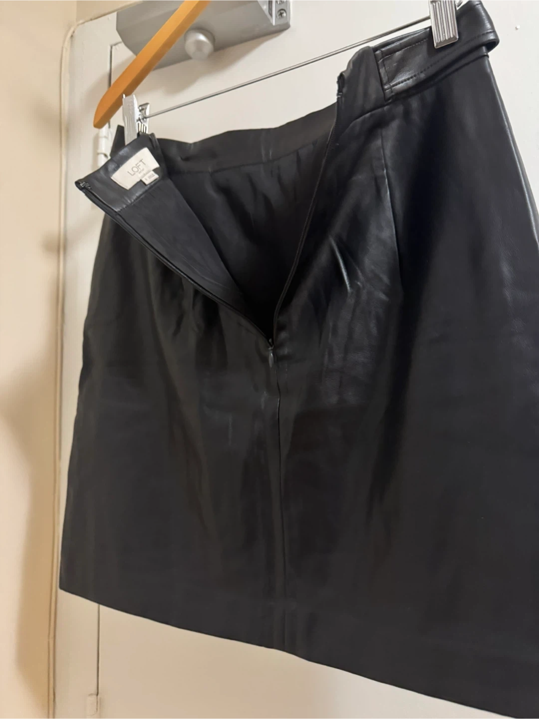 stylish LOFT black faux leather mini skirt. It's never used. The skirt is a size 4.