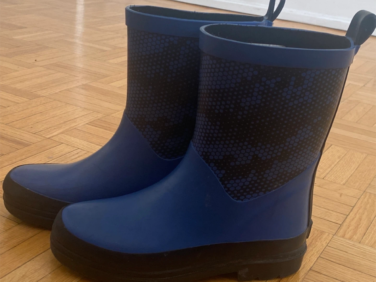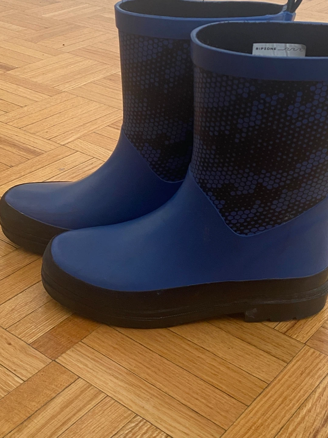 These blue rain boots are from Ripzone. They feature a fun, patterned design on the upper calf. The soles are black and textured for grip. Great for keeping feet dry on wet days. Size 1 us
