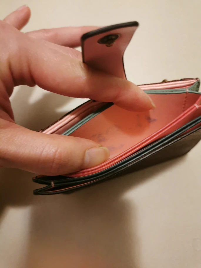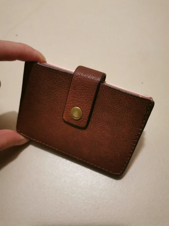 Fossil card holder wallet in good condition. It features a brown leather exterior with a snap closure and a zipper pocket on the back. Inside, there are multiple card slots and a pink interior. →Some colour on inside (pic 6) Size 4 x 2.5 x 0.5 (inc)