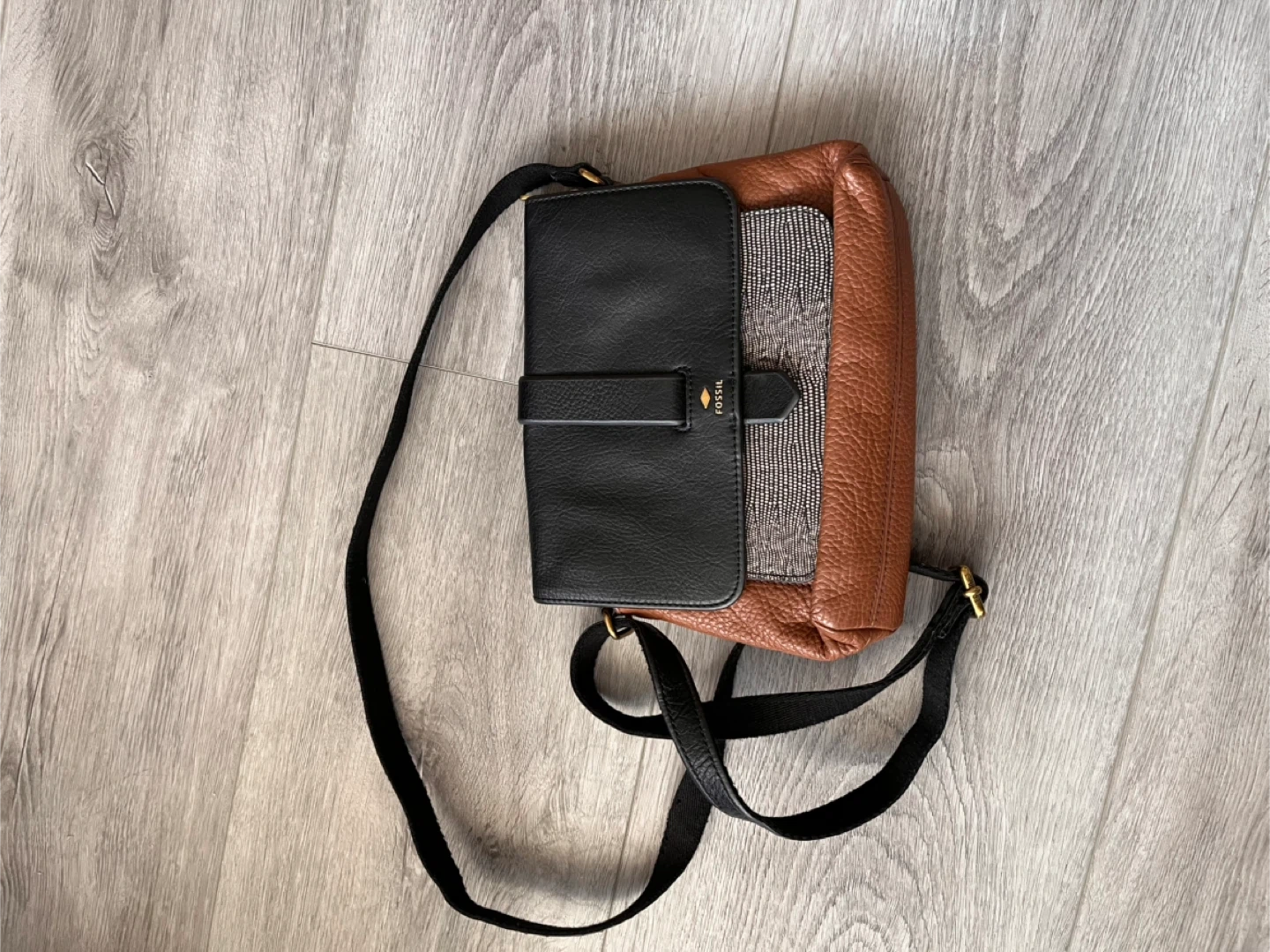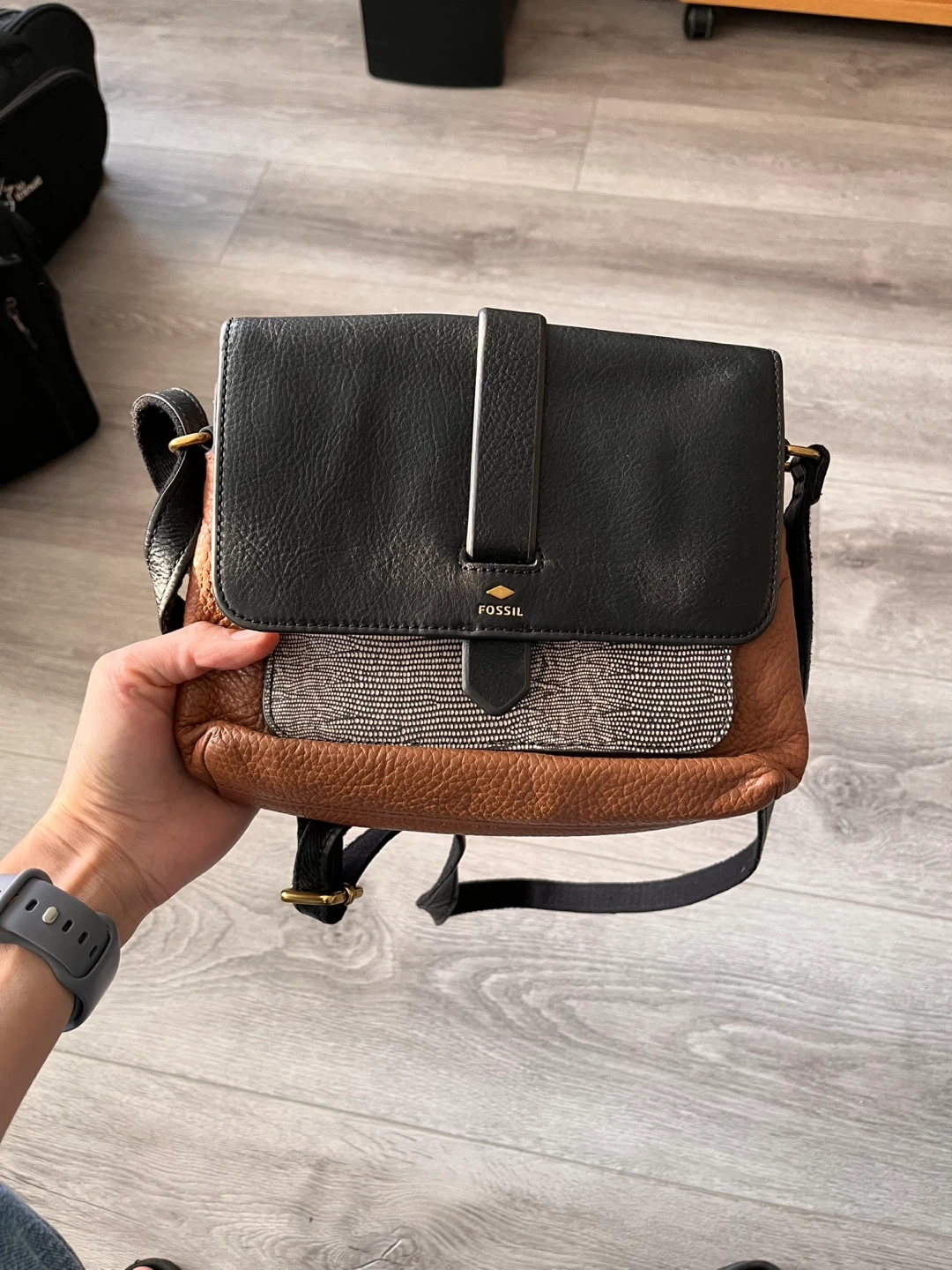 Check out this stylish Fossil crossbody bag! It features a mix of black and brown leather, giving it a unique and versatile look. The bag is in great condition and perfect for everyday use. It has a comfortable strap and is the ideal size for carrying your essentials. Don't miss out!