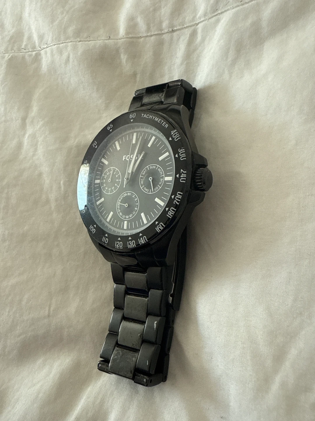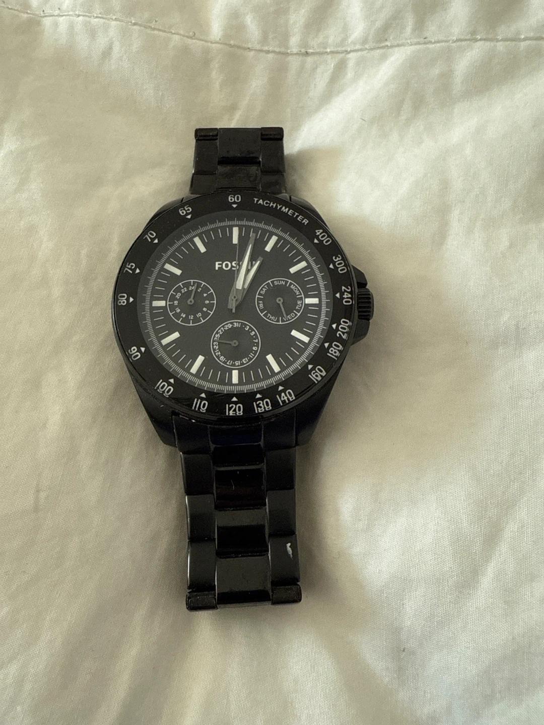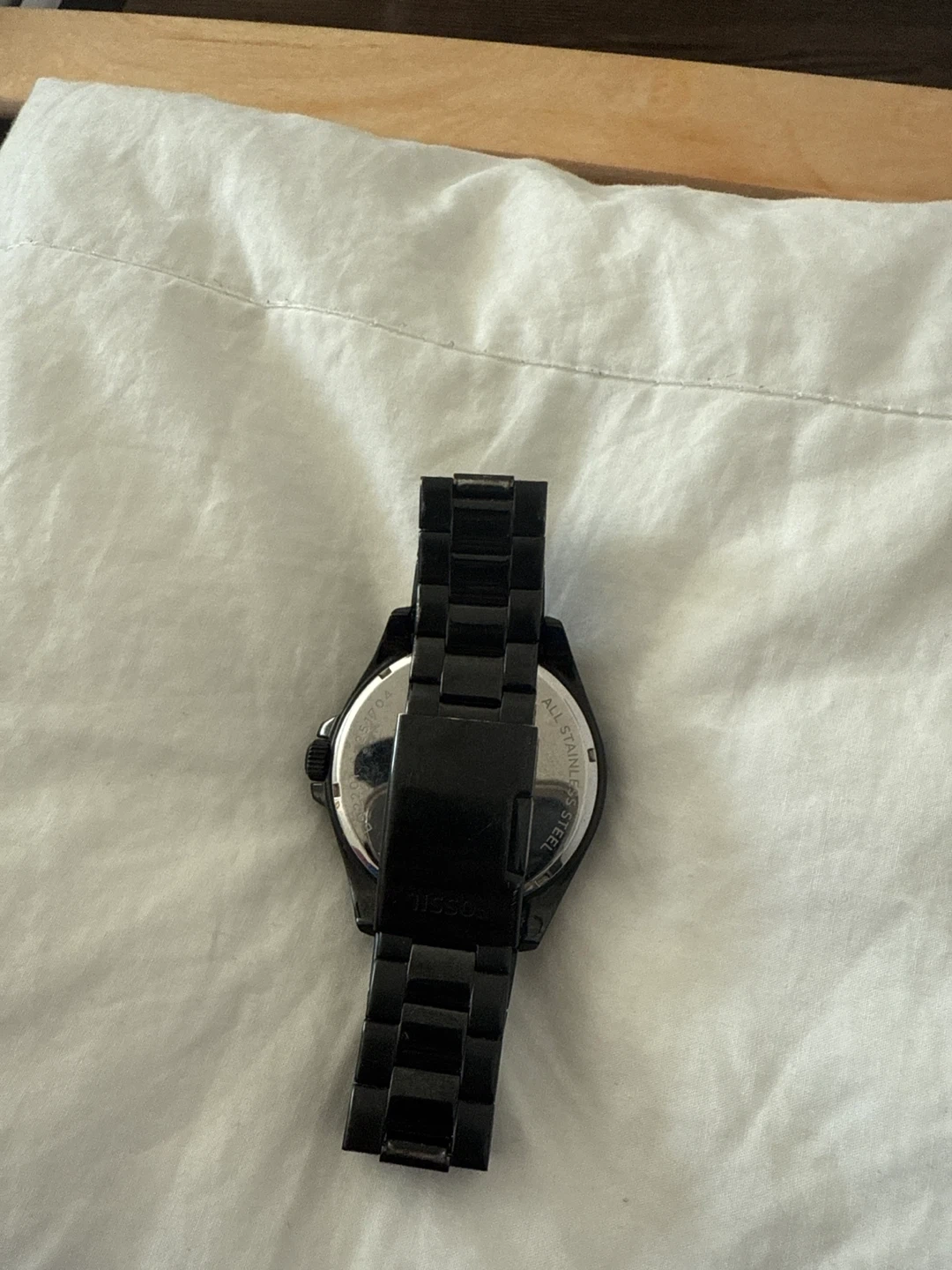 Looking to sell my Fossil watch! It's a sleek, all-black design made of stainless steel. A stylish accessory to complete any outfit! Battery is dead