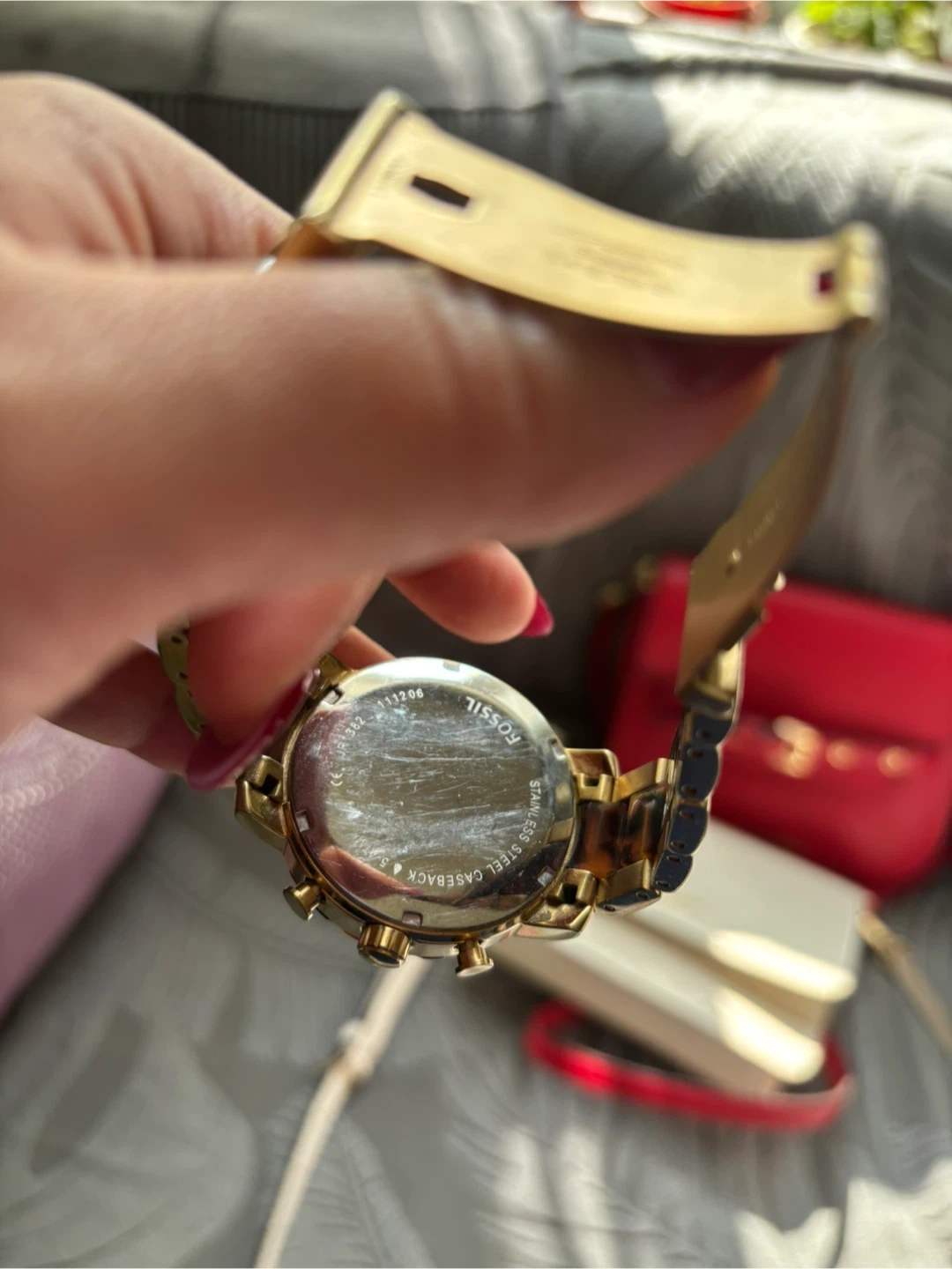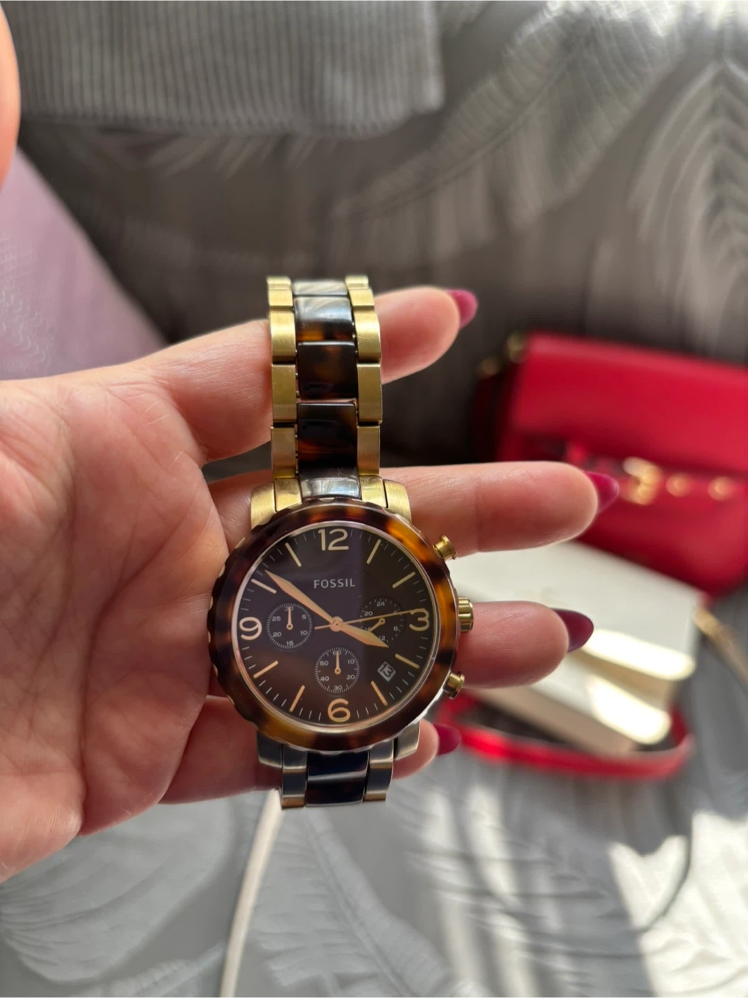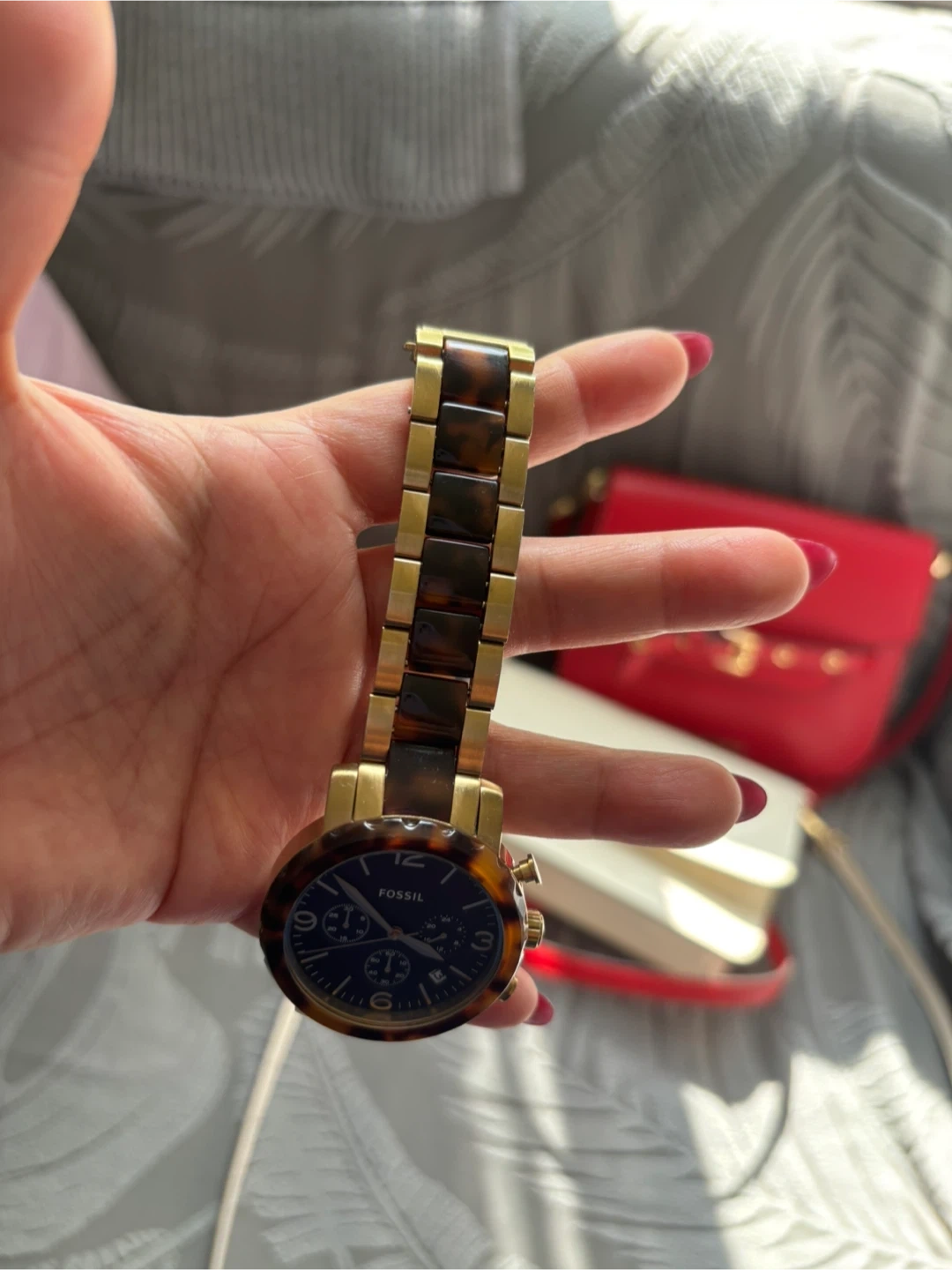 39Selling a Fossil Riley multi-function watch! It features a gold-tone band with tortoise shell accents. The watch face has a chronograph display. There are some signs of wear on the back of the case.