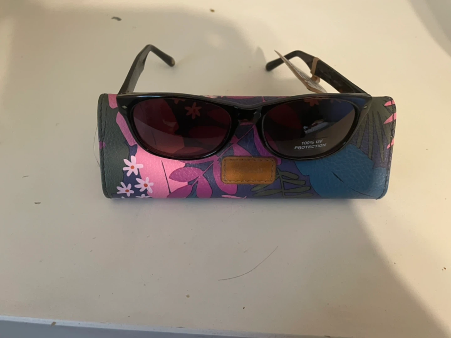 These Fossil sunglasses come with a stylish floral case. They have 100% UV protection. The original tag is still attached, showing a price of $55.00. A great find for sunny days!