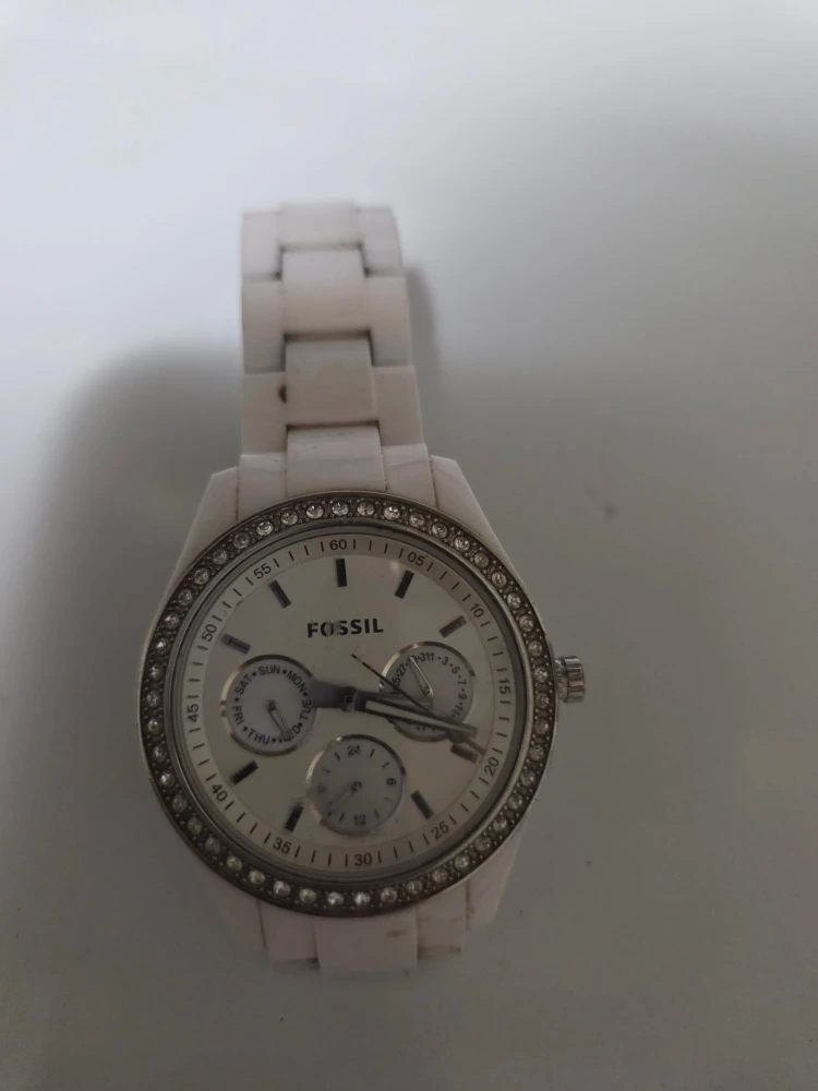 60Selling a Fossil women's watch with a white ceramic band. The watch face has a crystal-studded bezel and multiple subdials for day and date. It's in great condition and ready for a new home!