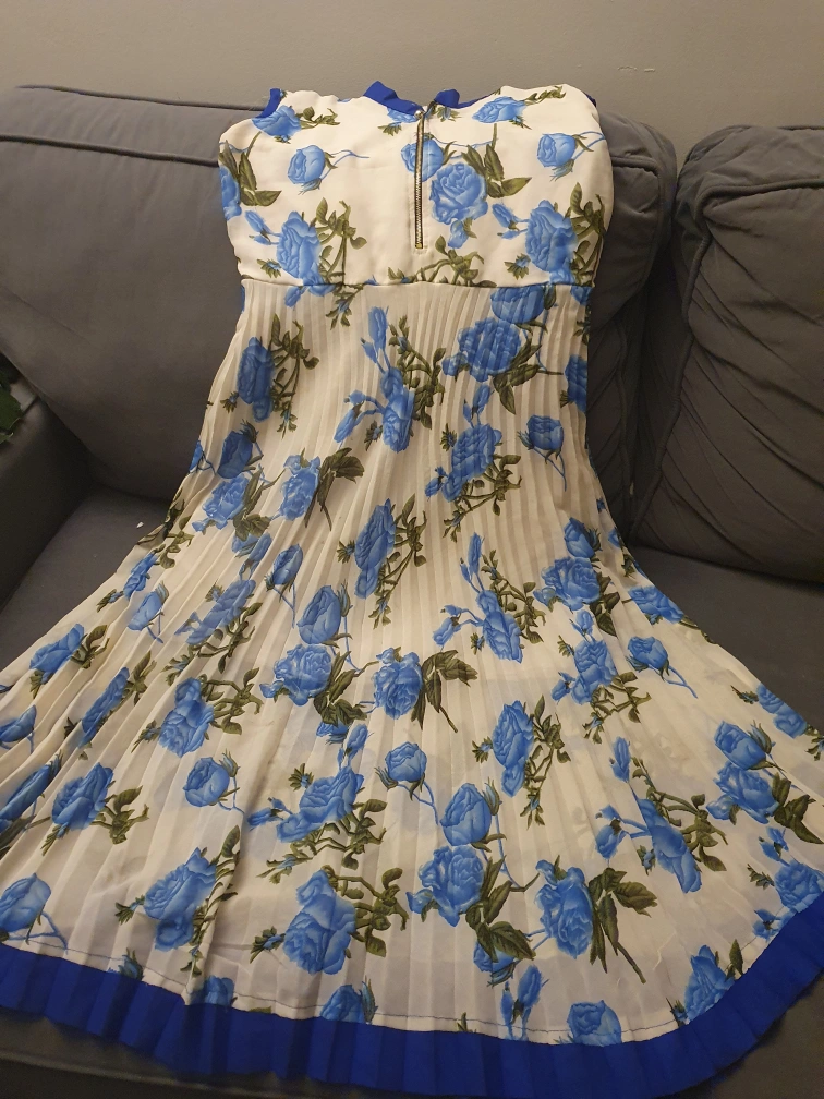 This dress has a lovely floral print in shades of blue on a white background. It features a zipper detail on the front and a pleated skirt. Perfect for a summer day out!