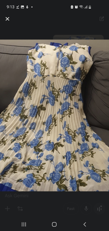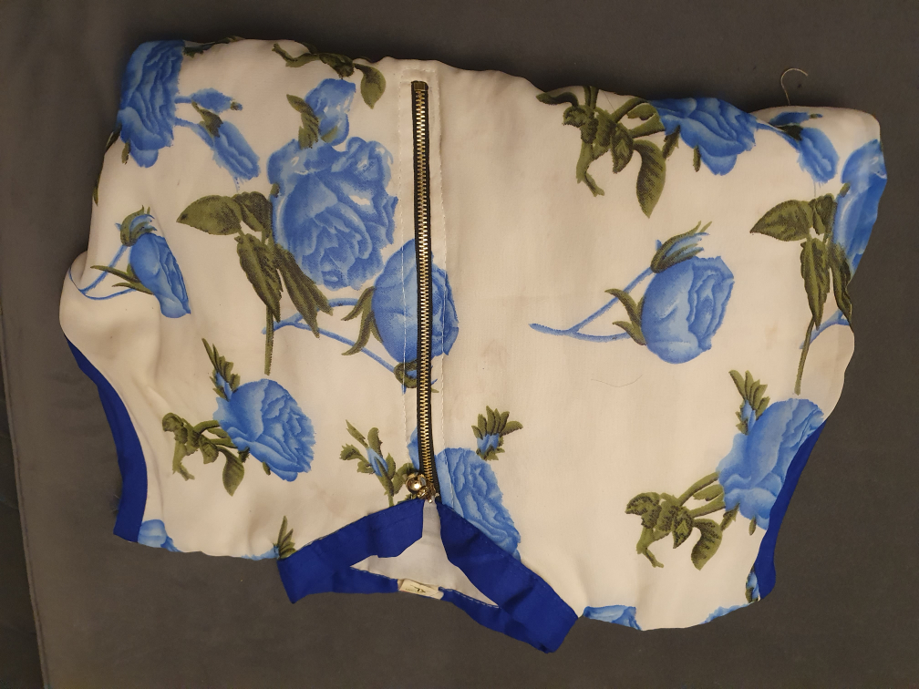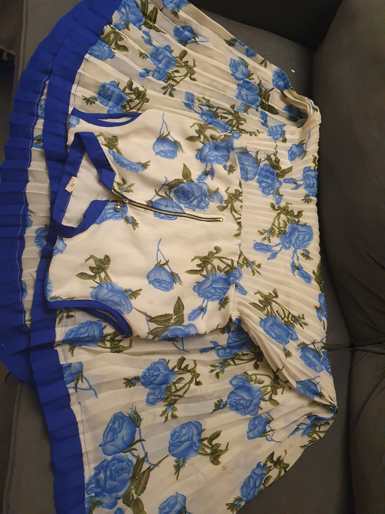 This dress has a lovely floral print in shades of blue on a white background. It features a zipper detail on the front and a pleated skirt. Perfect for a summer day out!