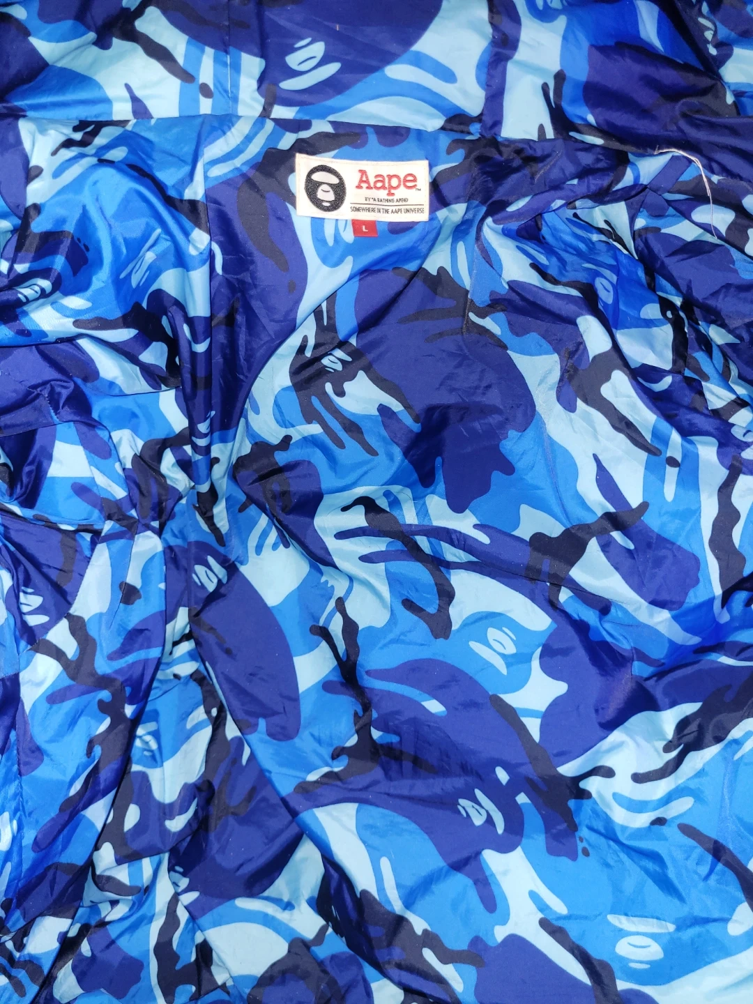 Check out this Aape by A Bathing Ape puffer jacket! It features a cool blue camo design and is a size L. Perfect for staying warm and stylish!