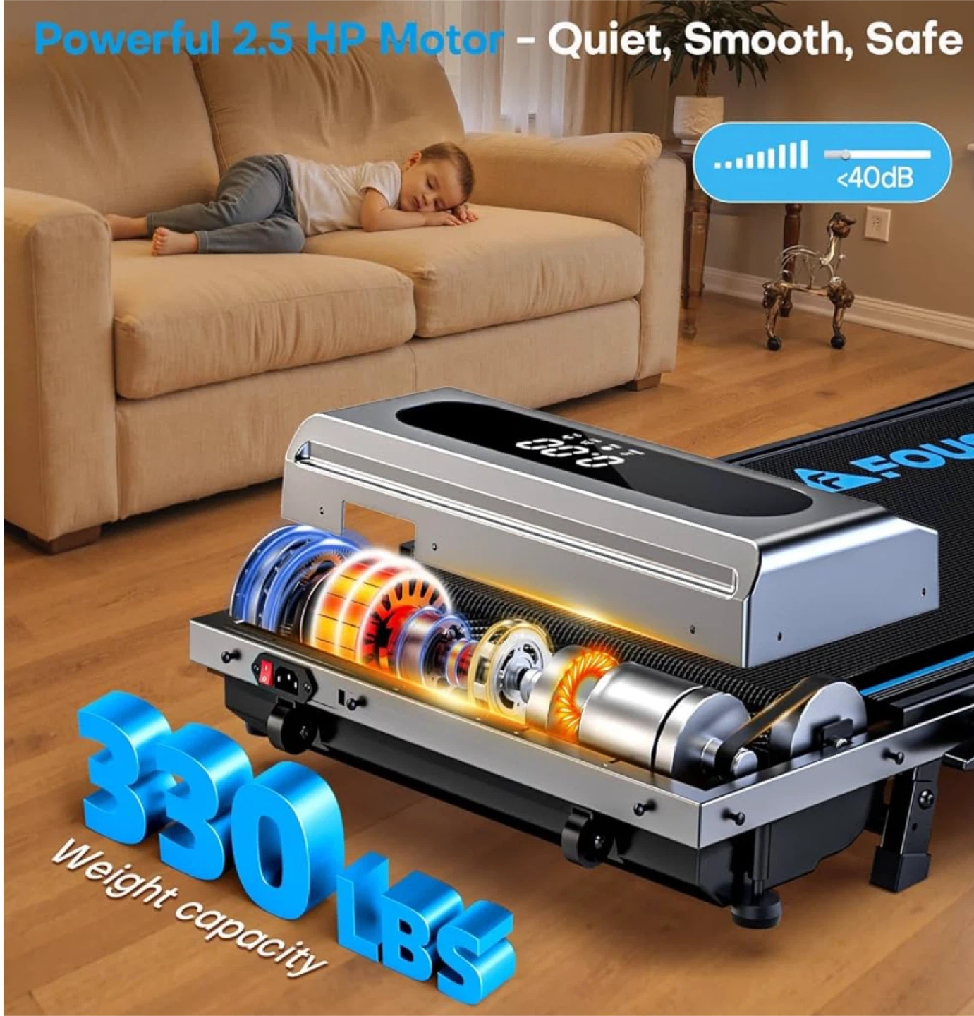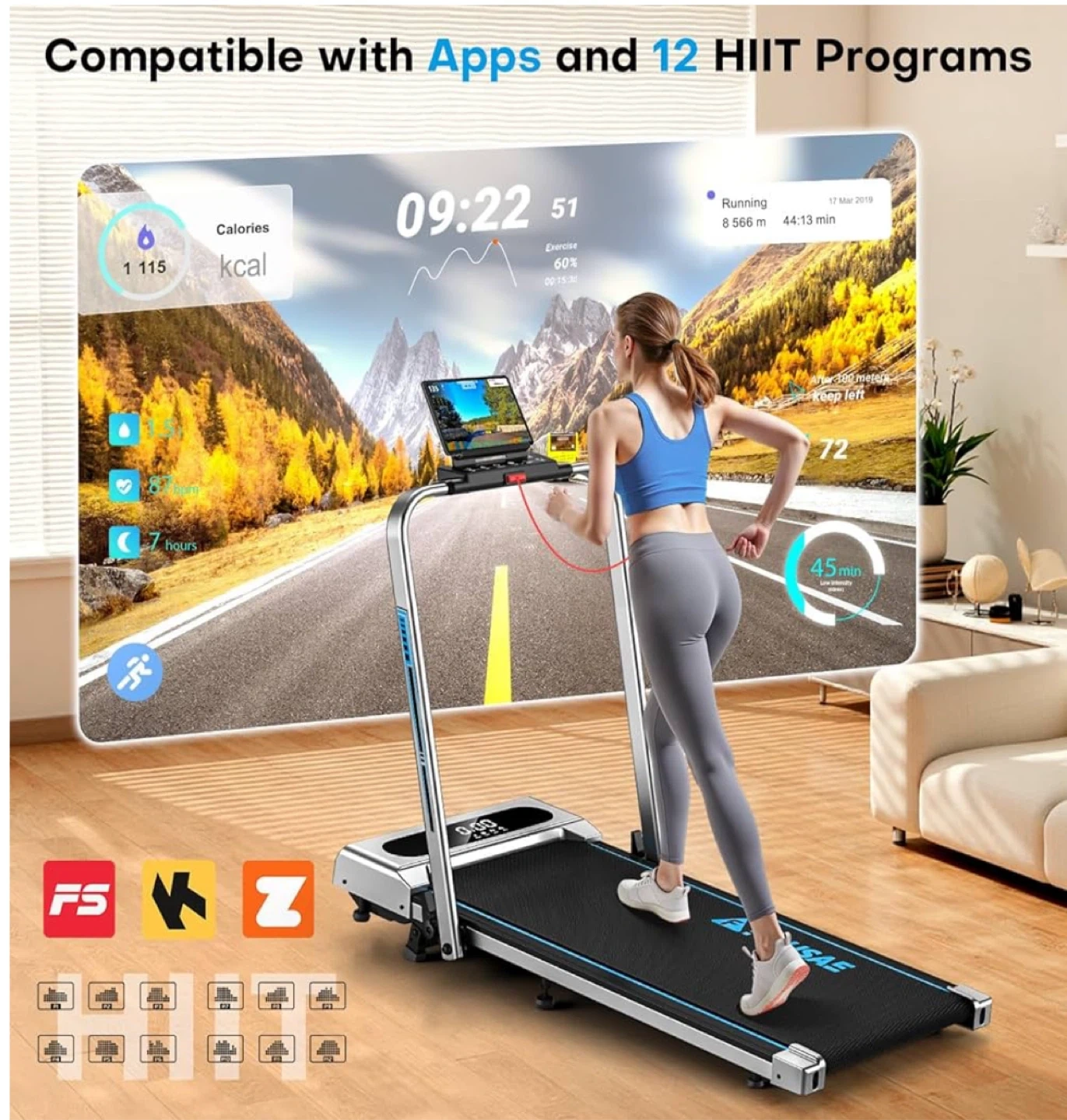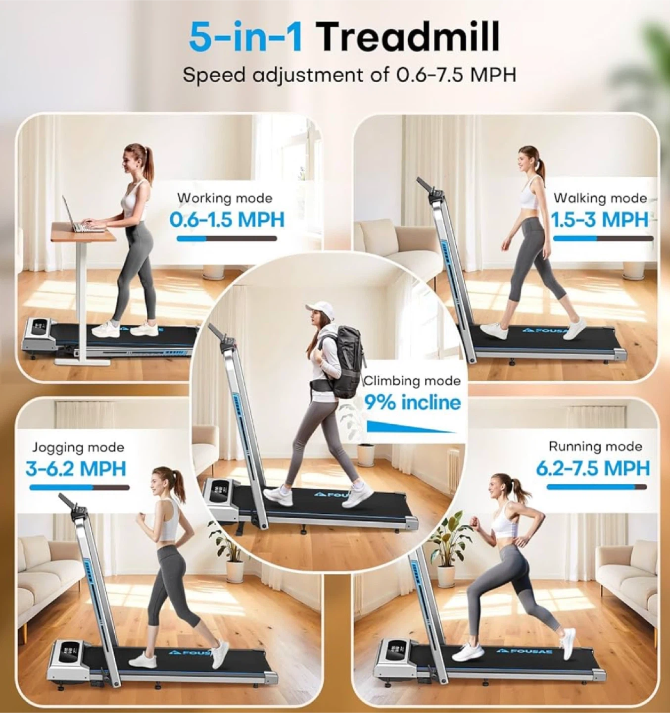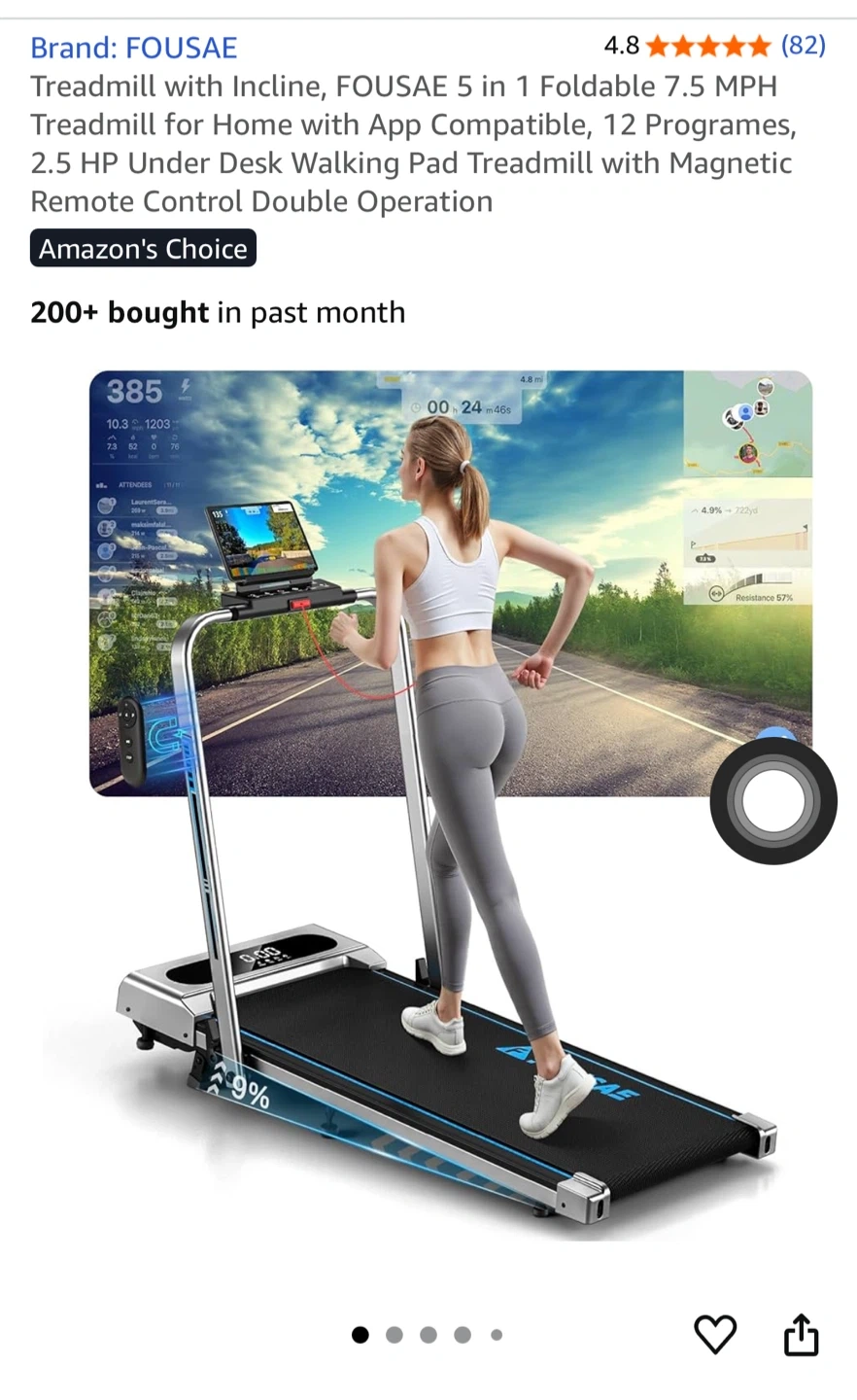 Get your workout in with this Fousae 5-in-1 foldable treadmill! It's got a speed adjustment of 0.6-7.5 MPH and features multiple modes including working, walking, climbing, jogging, and running. It's compatible with apps and has 12 HIIT programs. The powerful 2.5 HP motor is quiet, smooth, and safe. It can handle a weight capacity of 330 lbs.