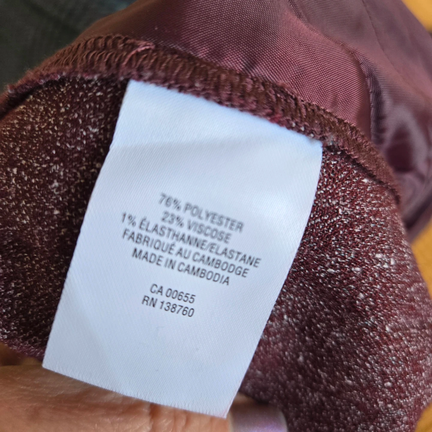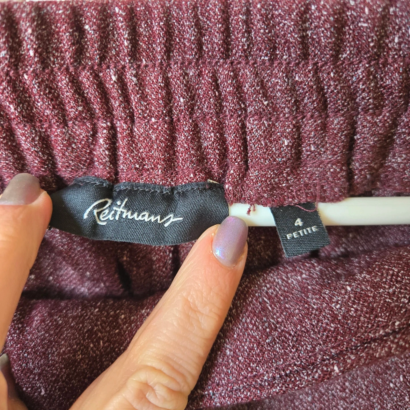 These Reitmans pants are burgundy with a tweed-like pattern. They're a petite size 4 and made from 76% polyester, 23% viscose, and 1% elastane. They feature an elastic waistband with a drawstring and pockets. Super comfy!