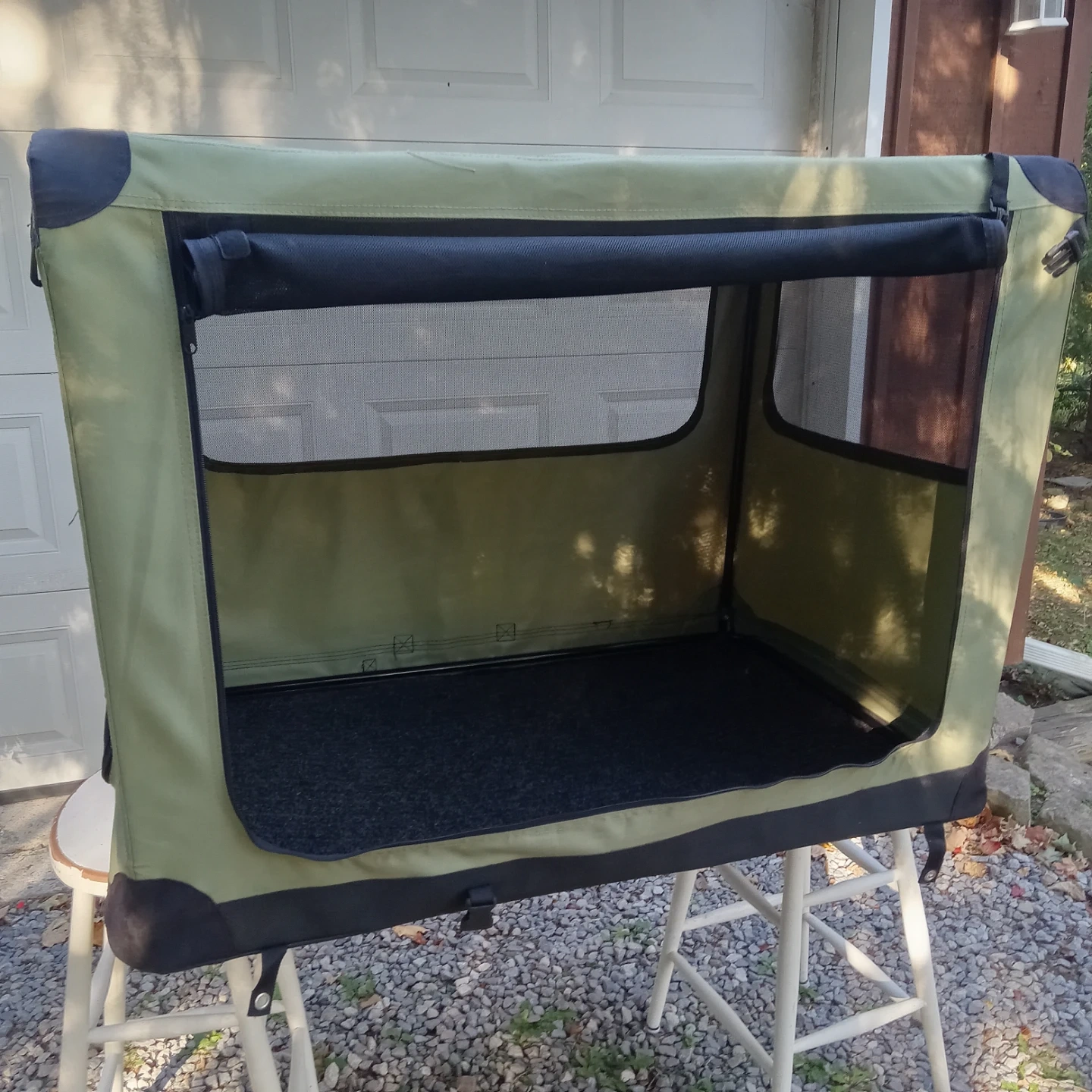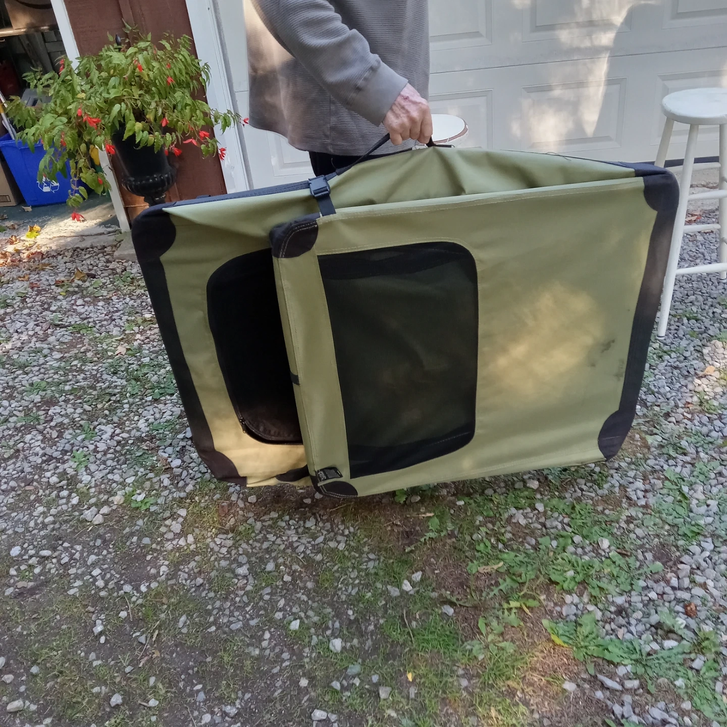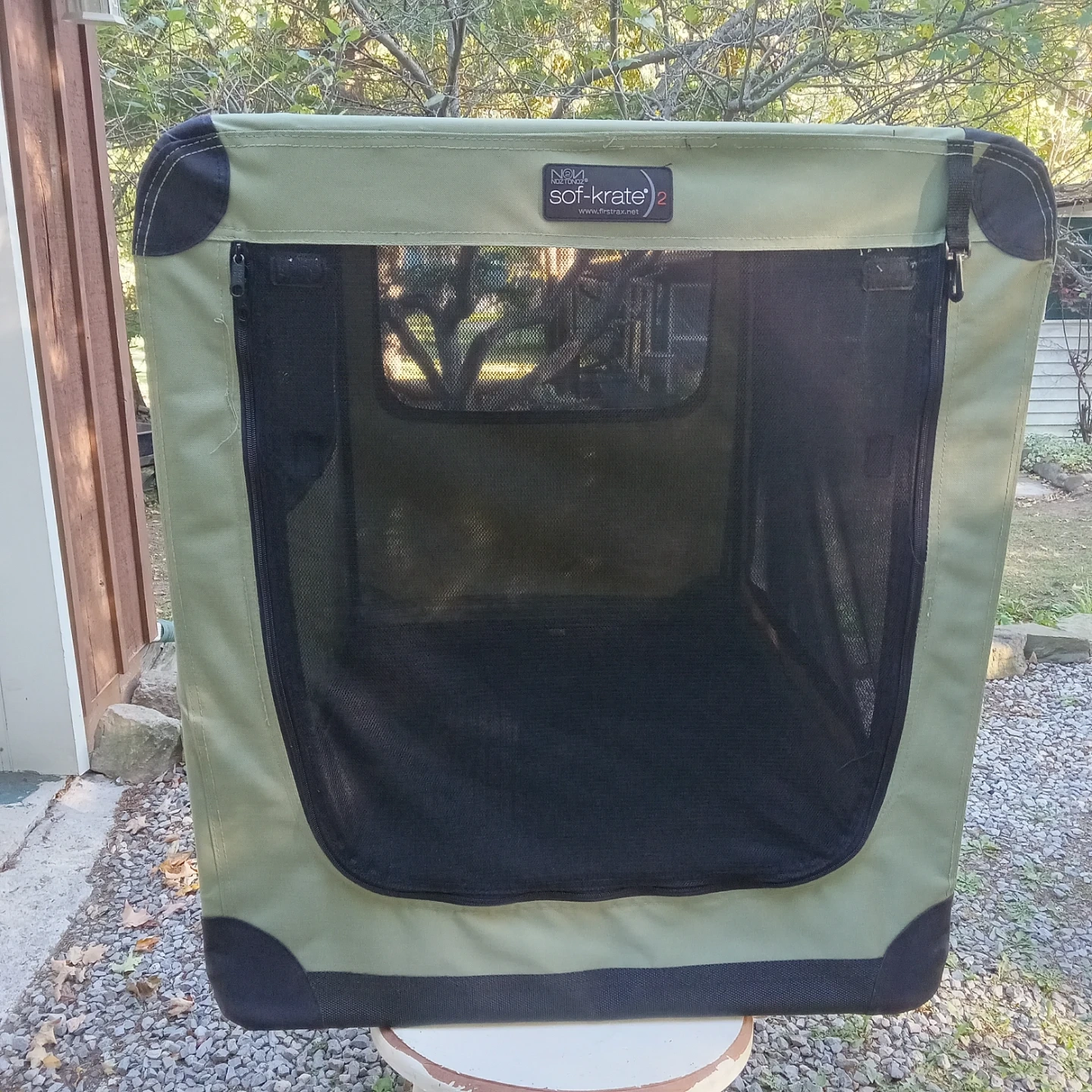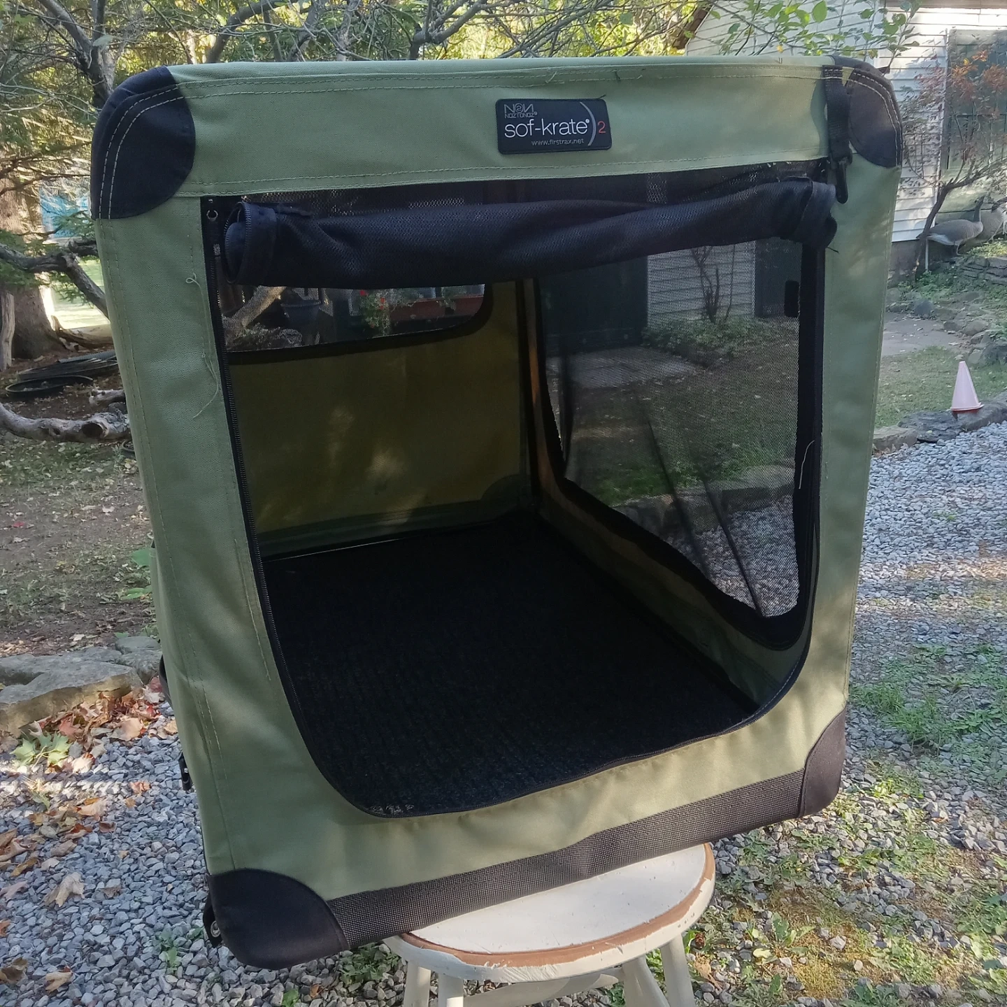 This is a Noztonoz Sof-Krate 2 pet carrier. It's made of durable fabric with mesh windows for ventilation. The crate folds flat for easy storage and transport.