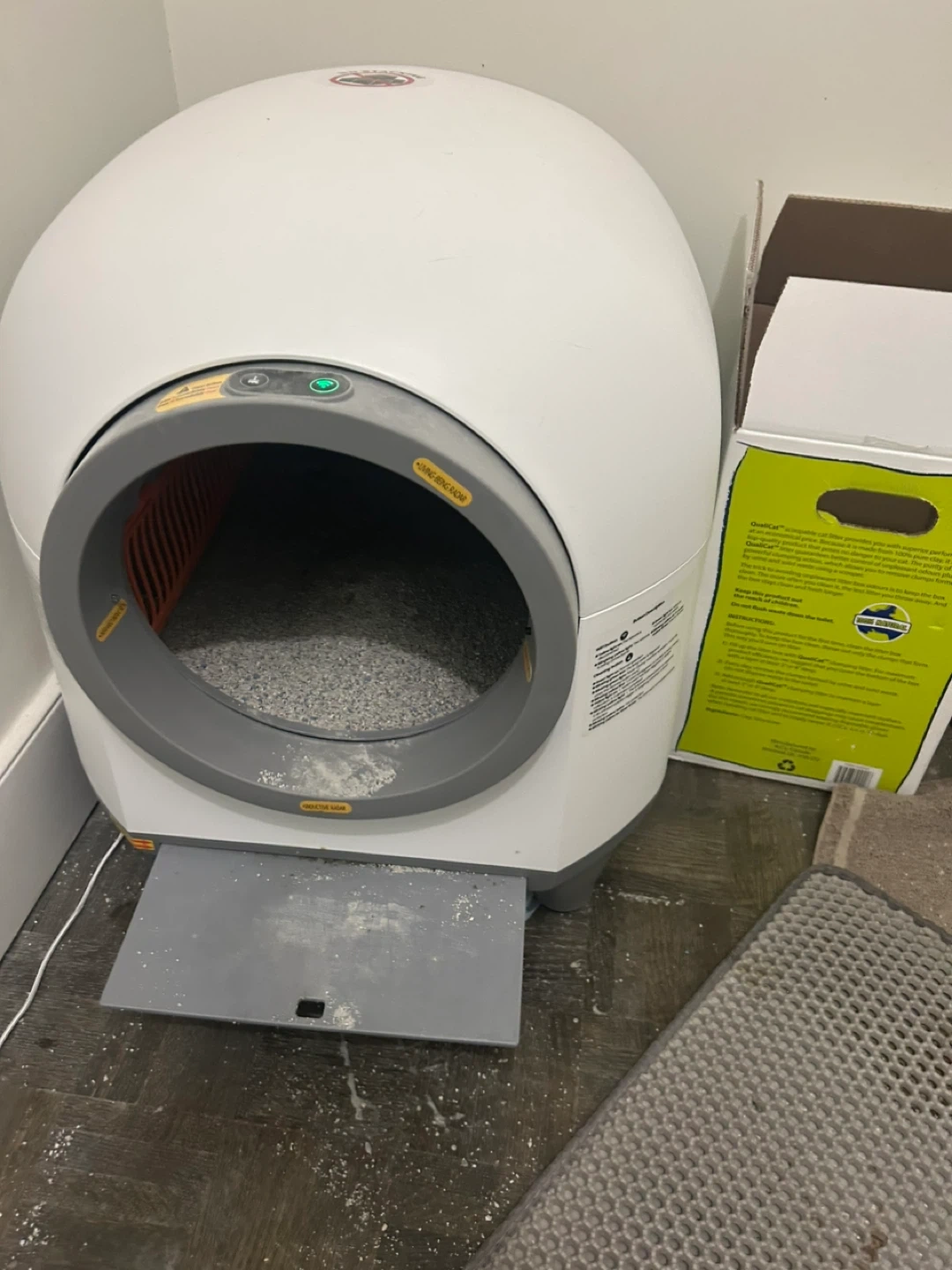 This automatic self-cleaning litter box helps keep your home tidy. It's designed for cats and simplifies litter box maintenance. This unit is white and grey.