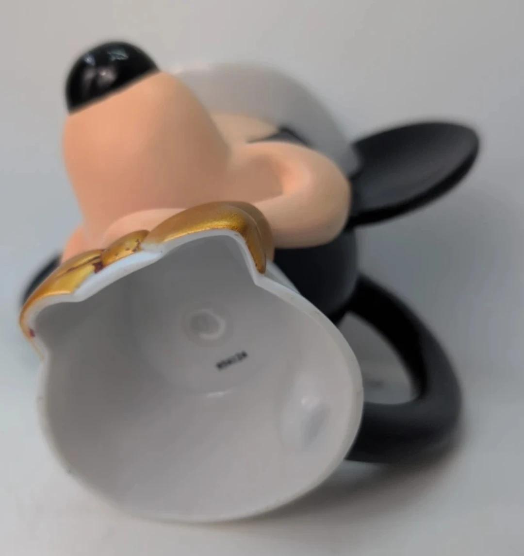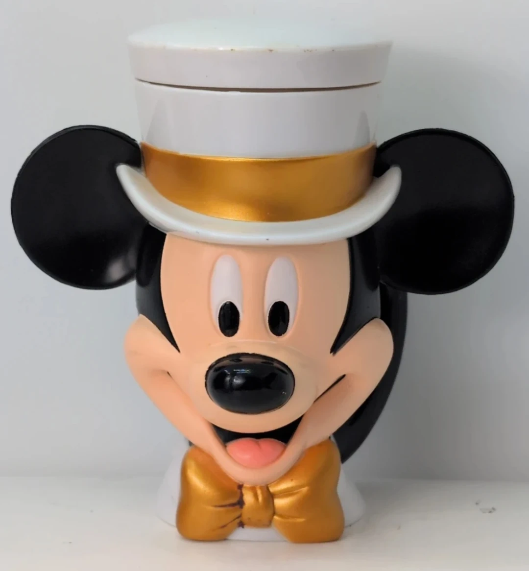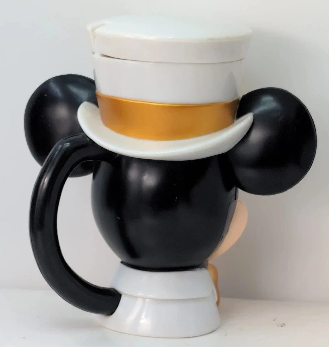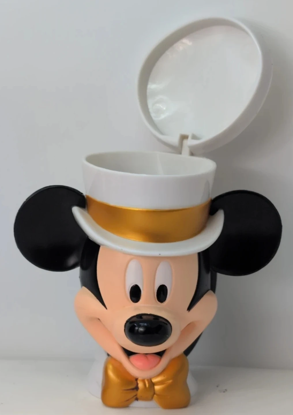 This is a fun Mickey Mouse tumbler cup. It features Mickey in a tuxedo with a top hat and bow tie. The cup has a white lid that opens and closes. Great for kids!