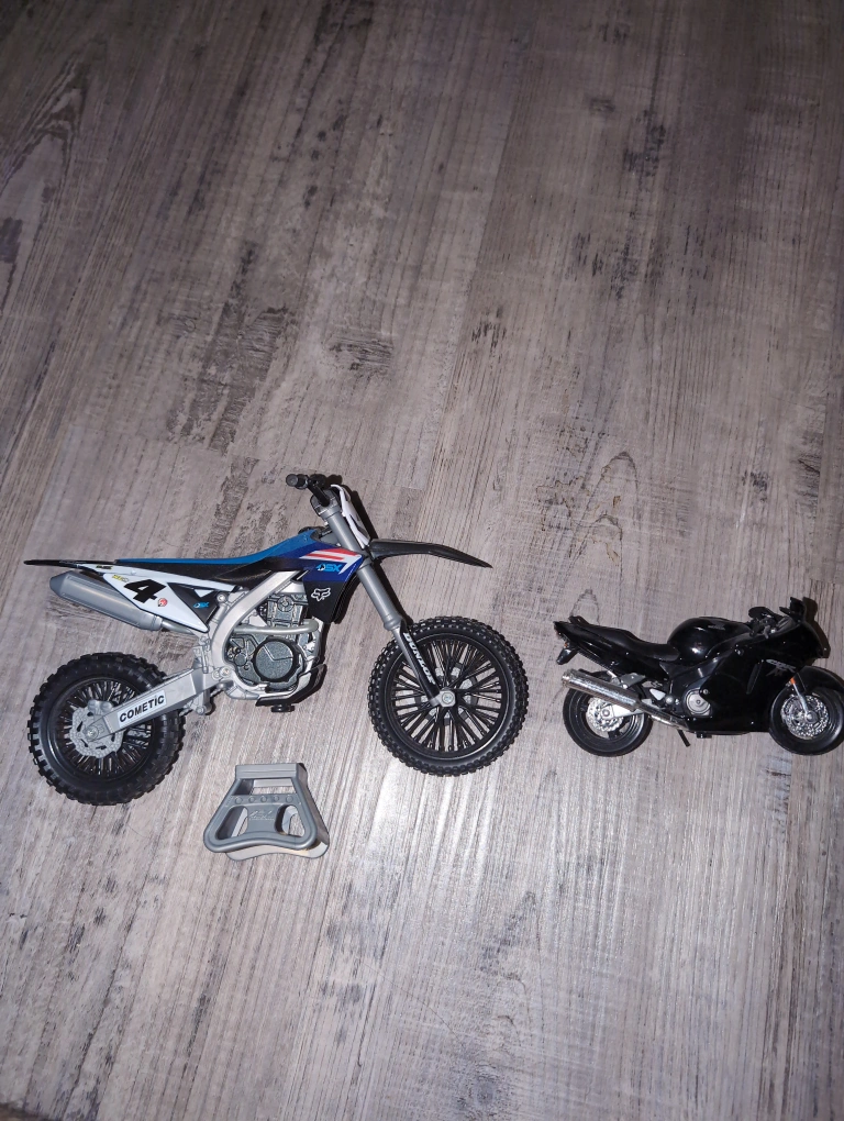 Selling two toy motorcycles! One is a Fox Racing dirt bike, and the other is a Honda CBR. They're both in great shape and would be perfect for a collector or a child who loves motorcycles.