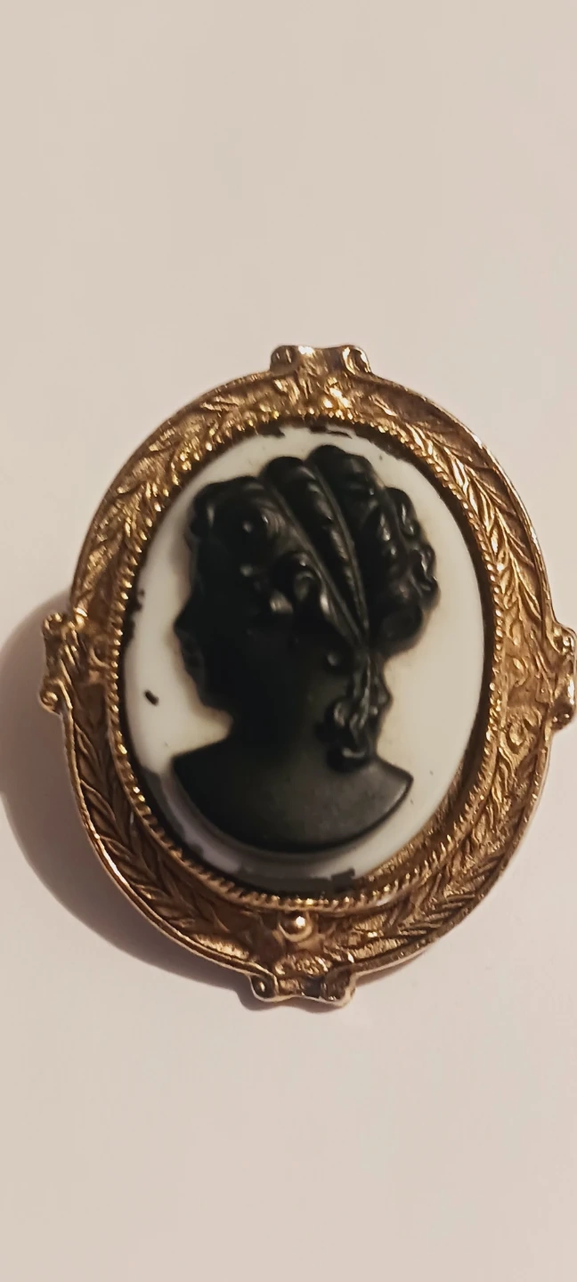 This vintage cameo brooch features a classic profile silhouette in black on a white background. It's set in an ornate gold-tone metal frame.. It's a lovely accessory for adding a touch of vintage charm to an outfit! 2"×1.5". Excellent condition. ALL MY PRICES ARE NEGOTIABLE !!