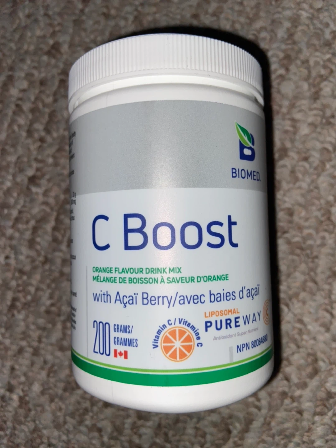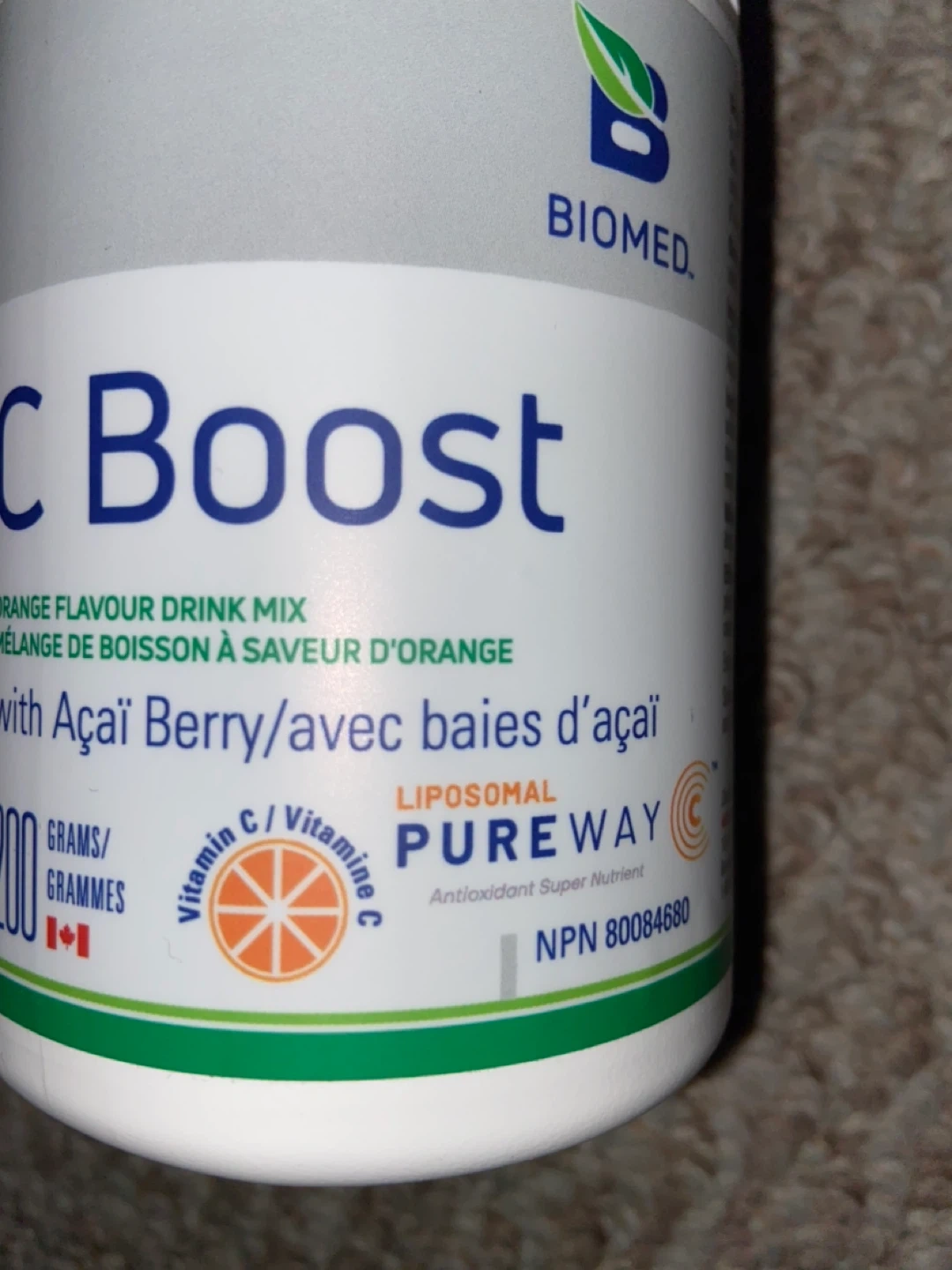 This is Biomed C Boost, an orange flavour drink mix. It contains Açaí Berry and is a liposomal PureWay Vitamin C. It's 200 grams.