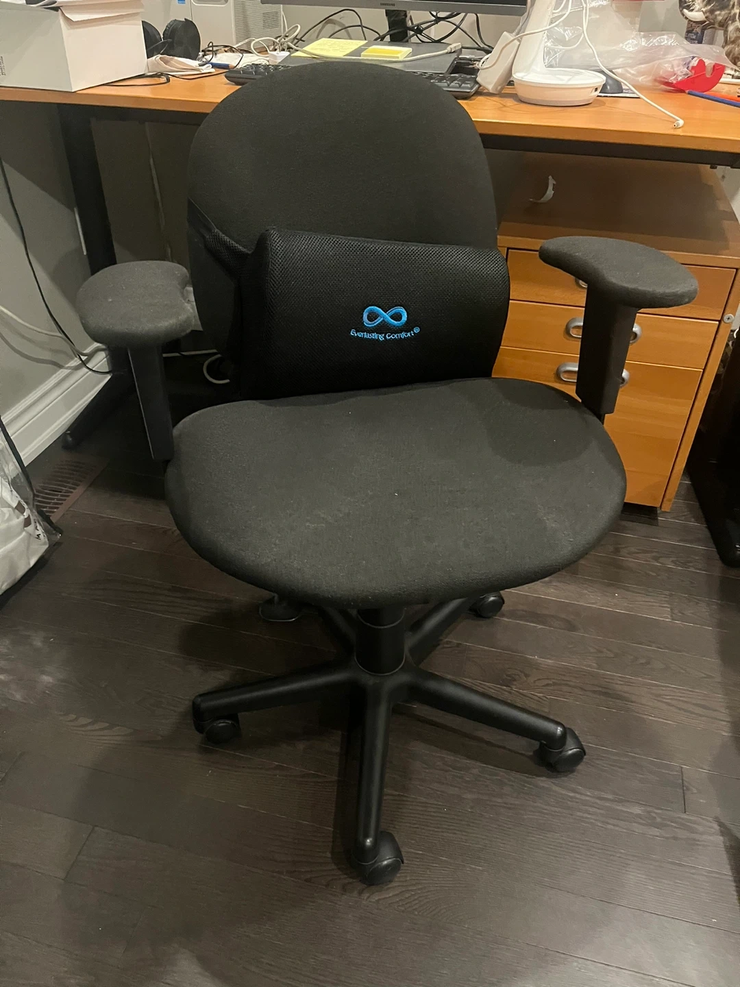 This black office chair offers adjustable lumbar support for comfort. It has a sturdy base with wheels for easy mobility. It's suitable for extended use at a desk.