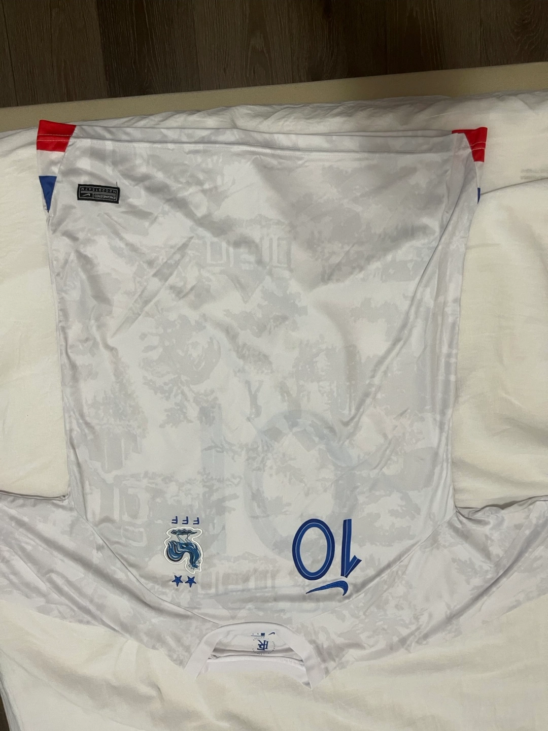 Men's size large France national football team jersey. White with blue and red accents. Features Mbappé's name and number 10 on the back. Nike branding visible.