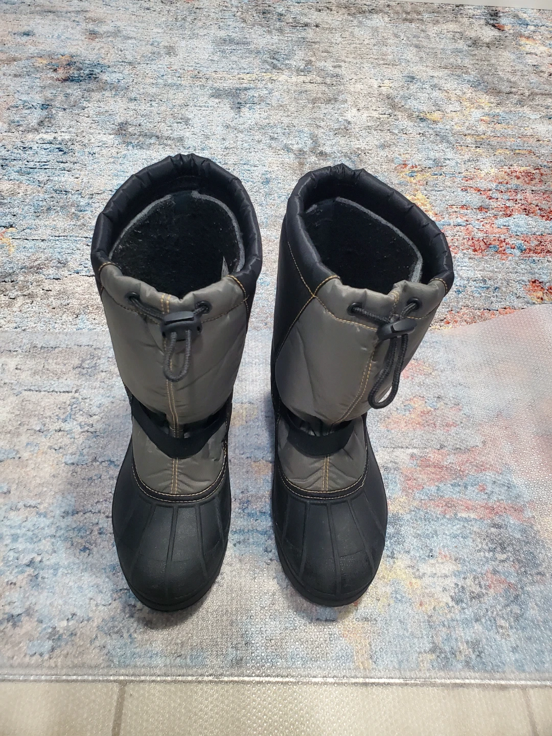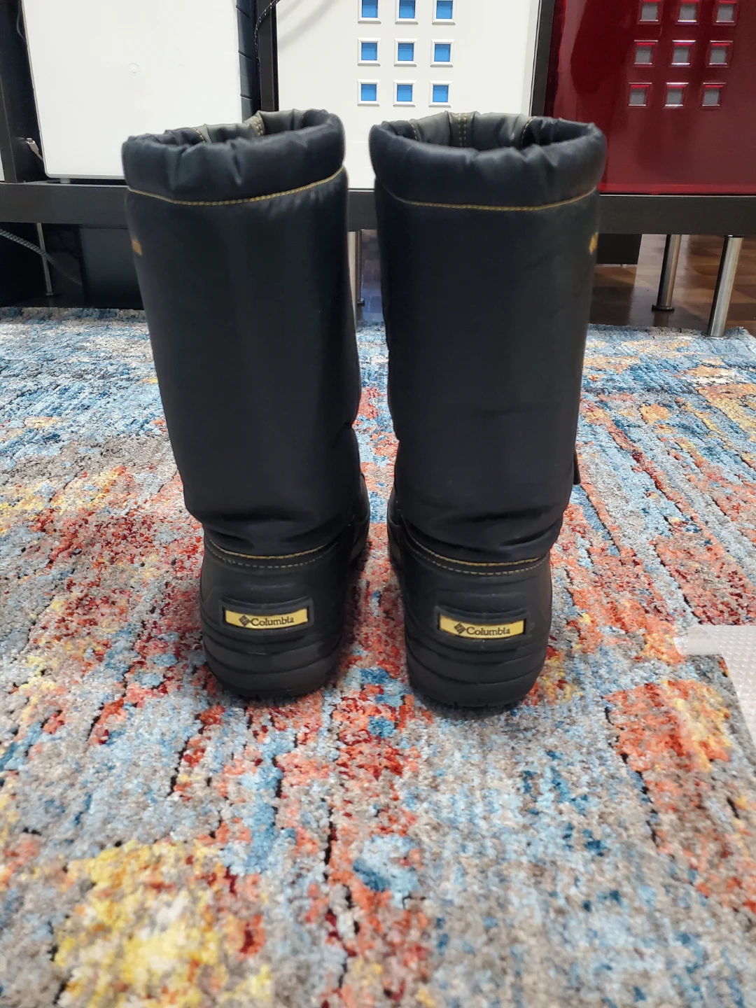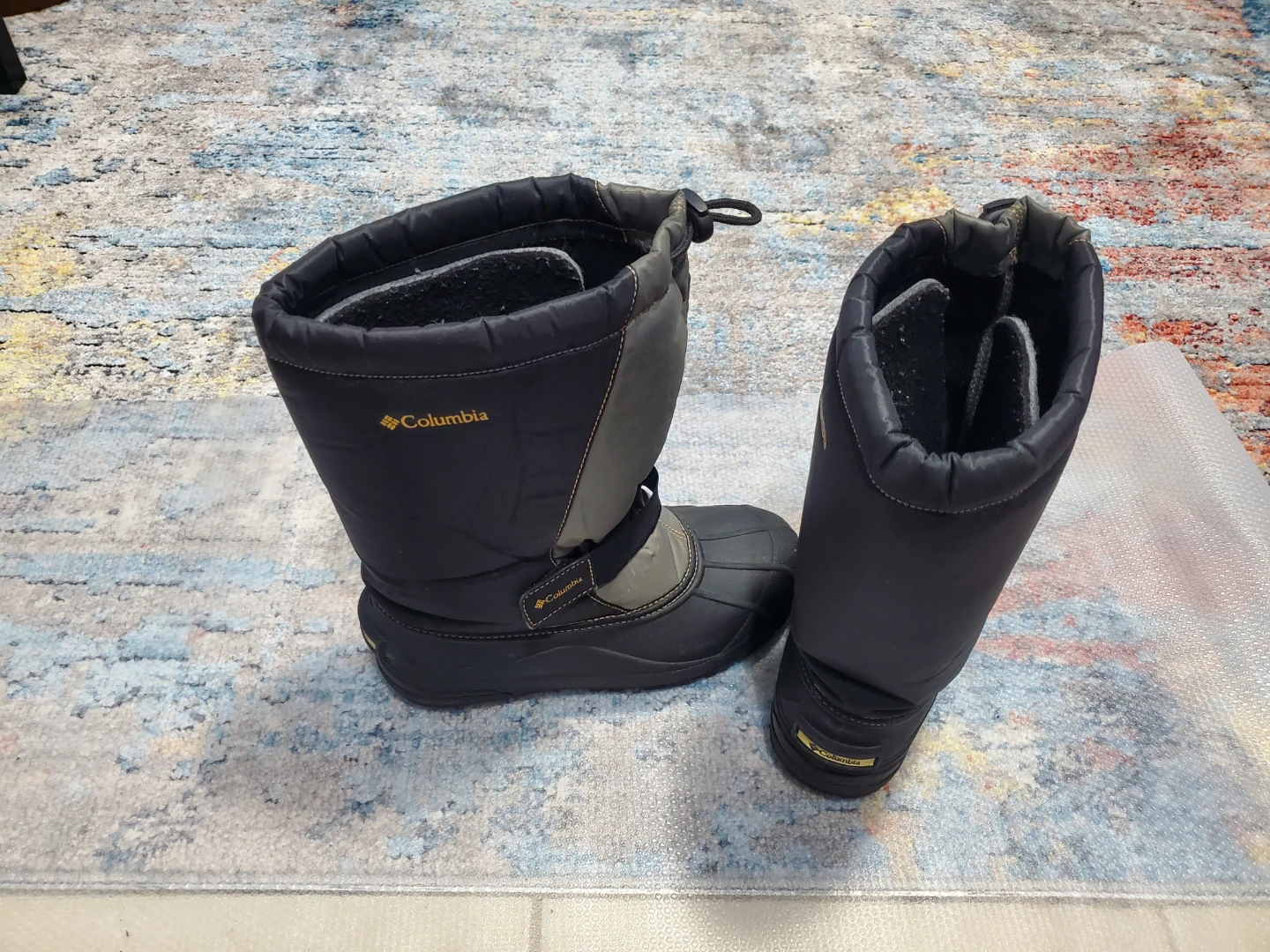 These Columbia snow boots are black and grey with a rubber sole. They're insulated for warmth and have a drawstring closure at the top.