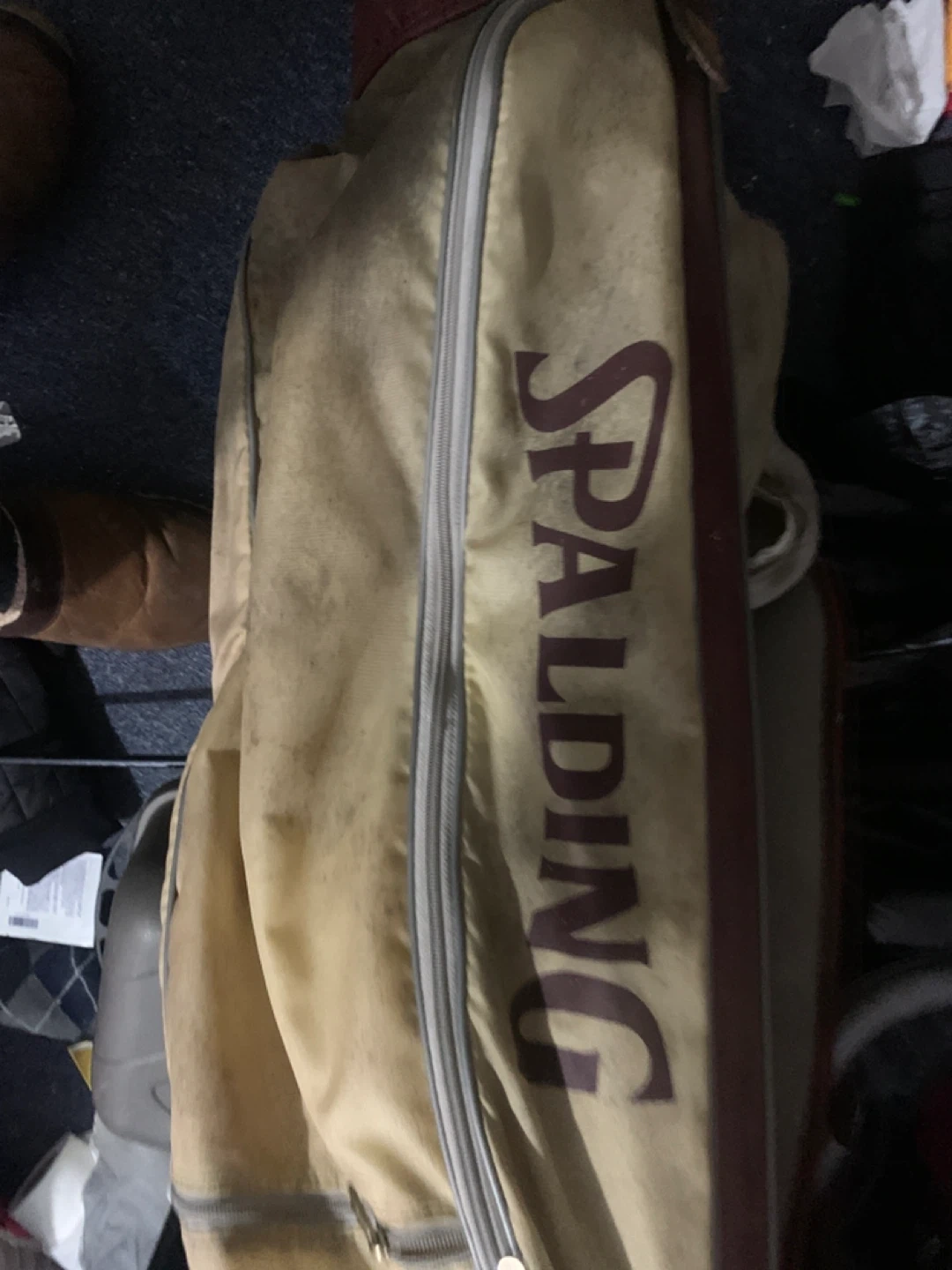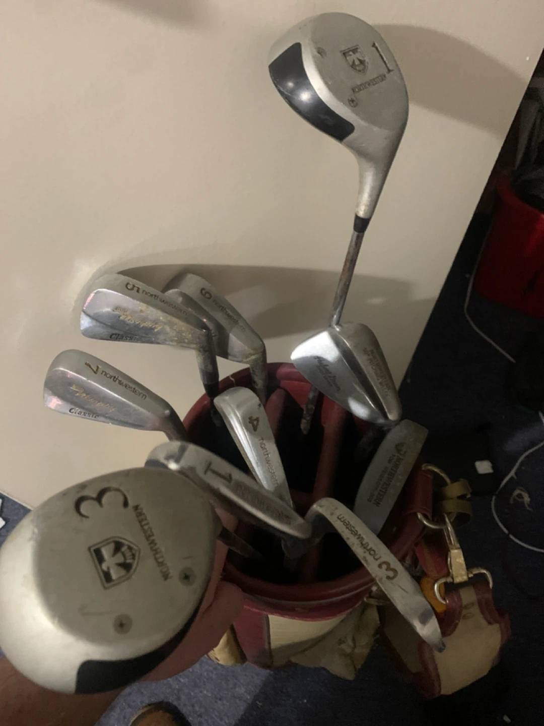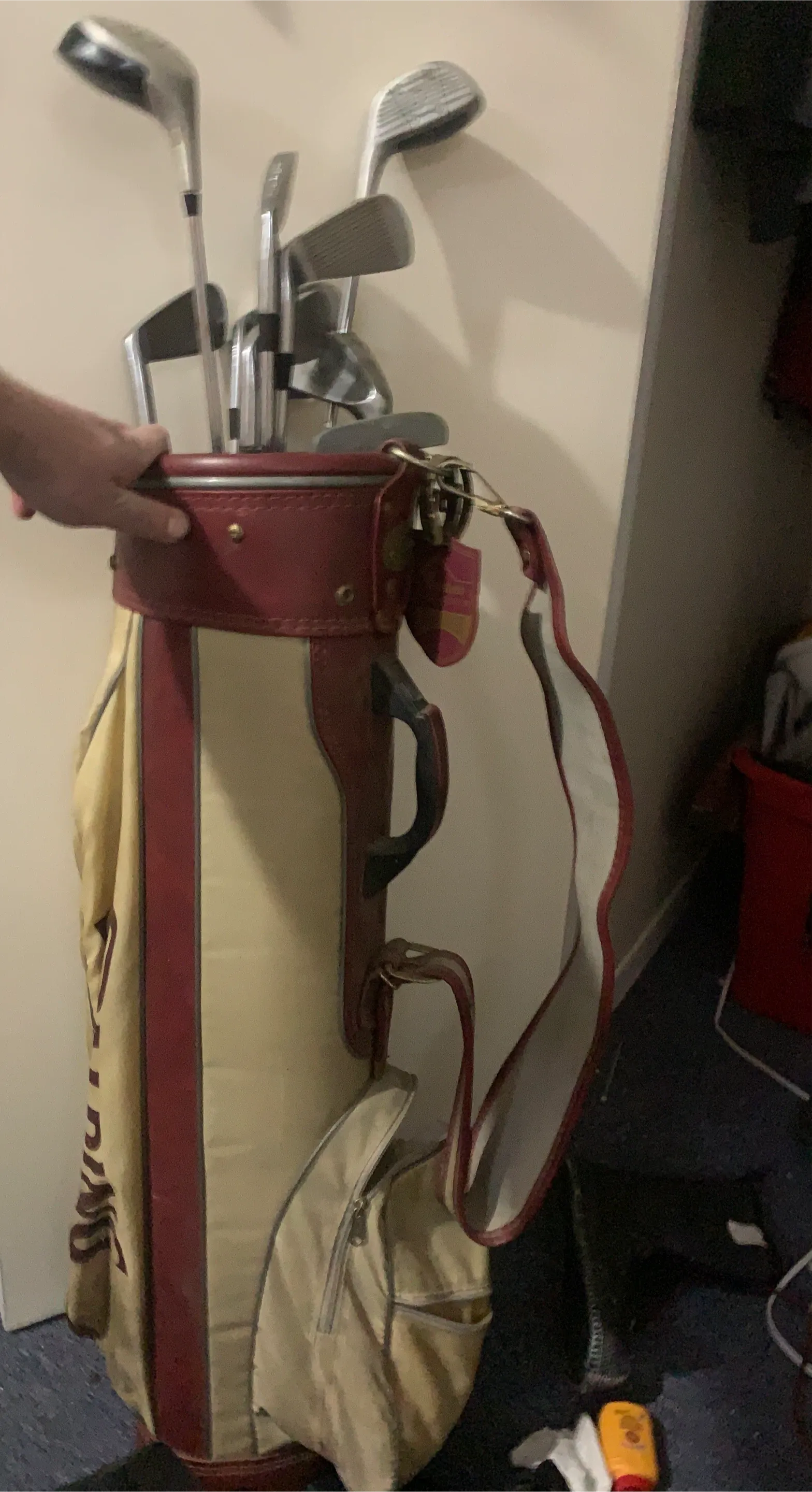 This is a vintage golf bag with a set of clubs. It's a classic design in beige and maroon. The bag has a sturdy handle and a shoulder strap. It's suitable for beginner golfers or collectors!