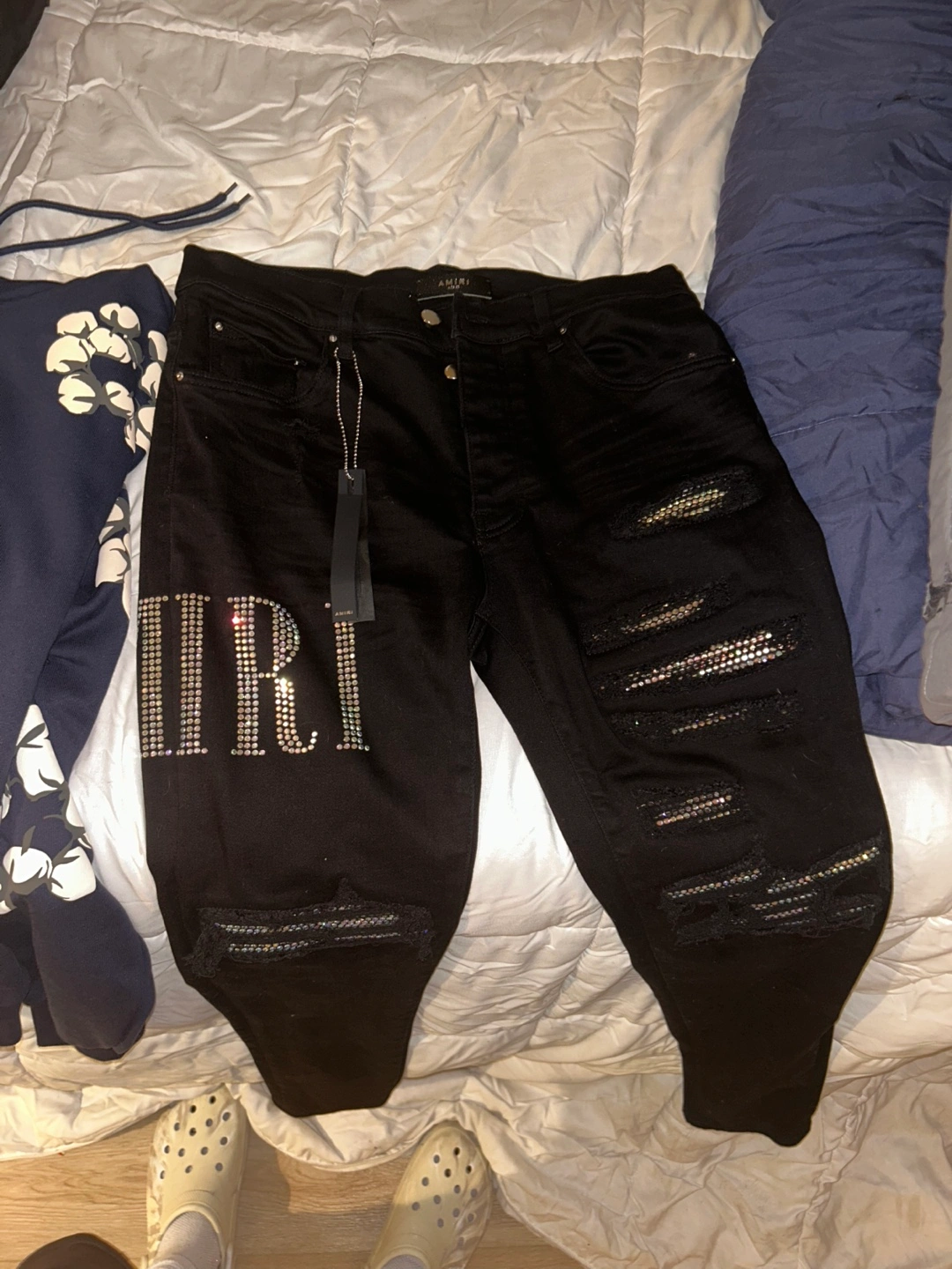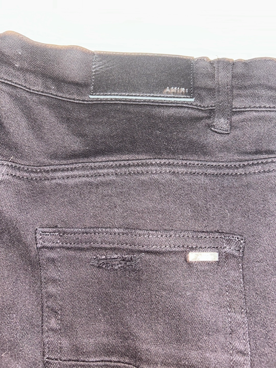 Black denim jeans, with multiple button closure. The shorts have embellished details. I gotta add more pics later