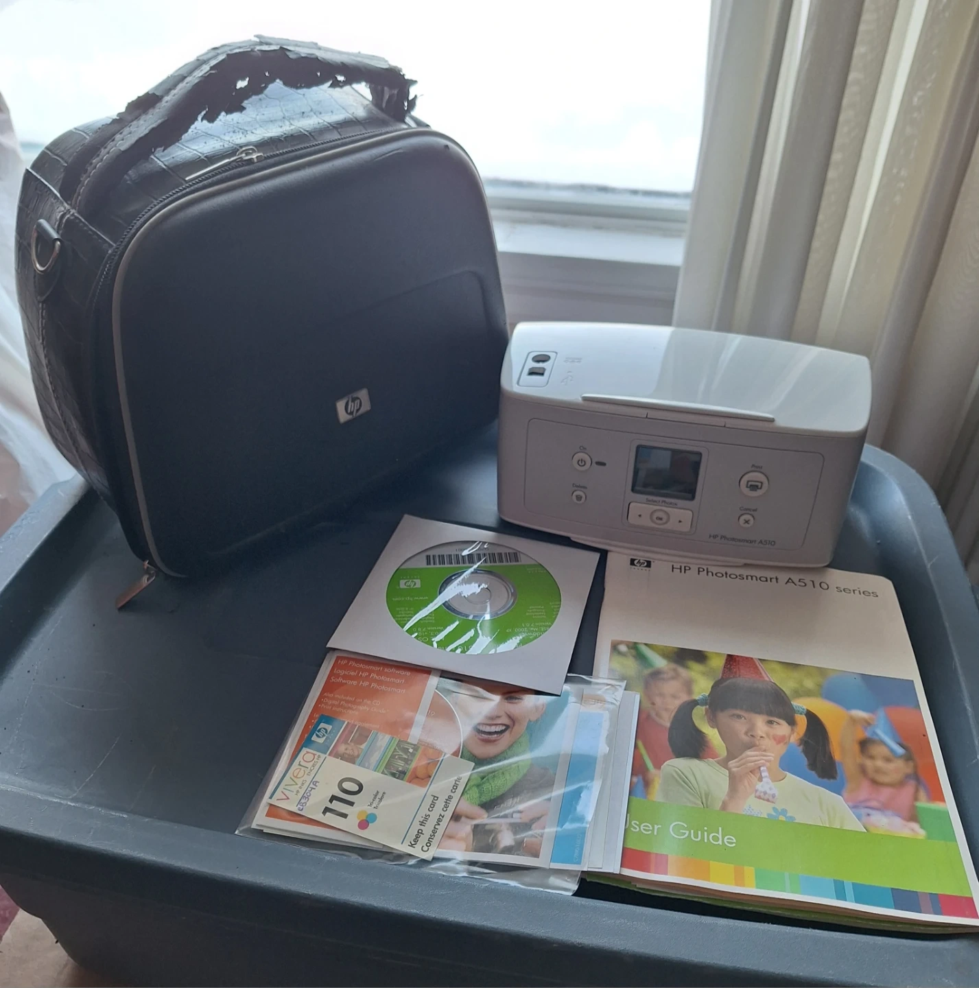 HP Photosmart A510 compact photo printer. It comes with the user guide, software CD, power cord and a carrying case. Great for printing photos at home or on the go. Uses print cartridge tri-colour 110. Pickup Scarborough Pharmacy and Ellesmere area.