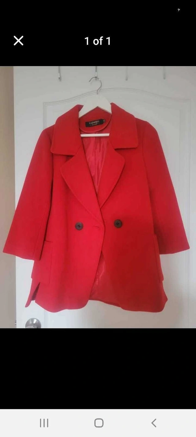 This is a Tahari red women's jacket, a stylish piece that features a double-breasted design with a vibrant red colour, perfect for adding a pop of colour to any outfit. The jacket is in good condition. Brand: Tahari Colour: Red Style: Double-Breasted Size: M Looking to give this jacket a new home! If the ad is up, it is still available! Cash accepted.