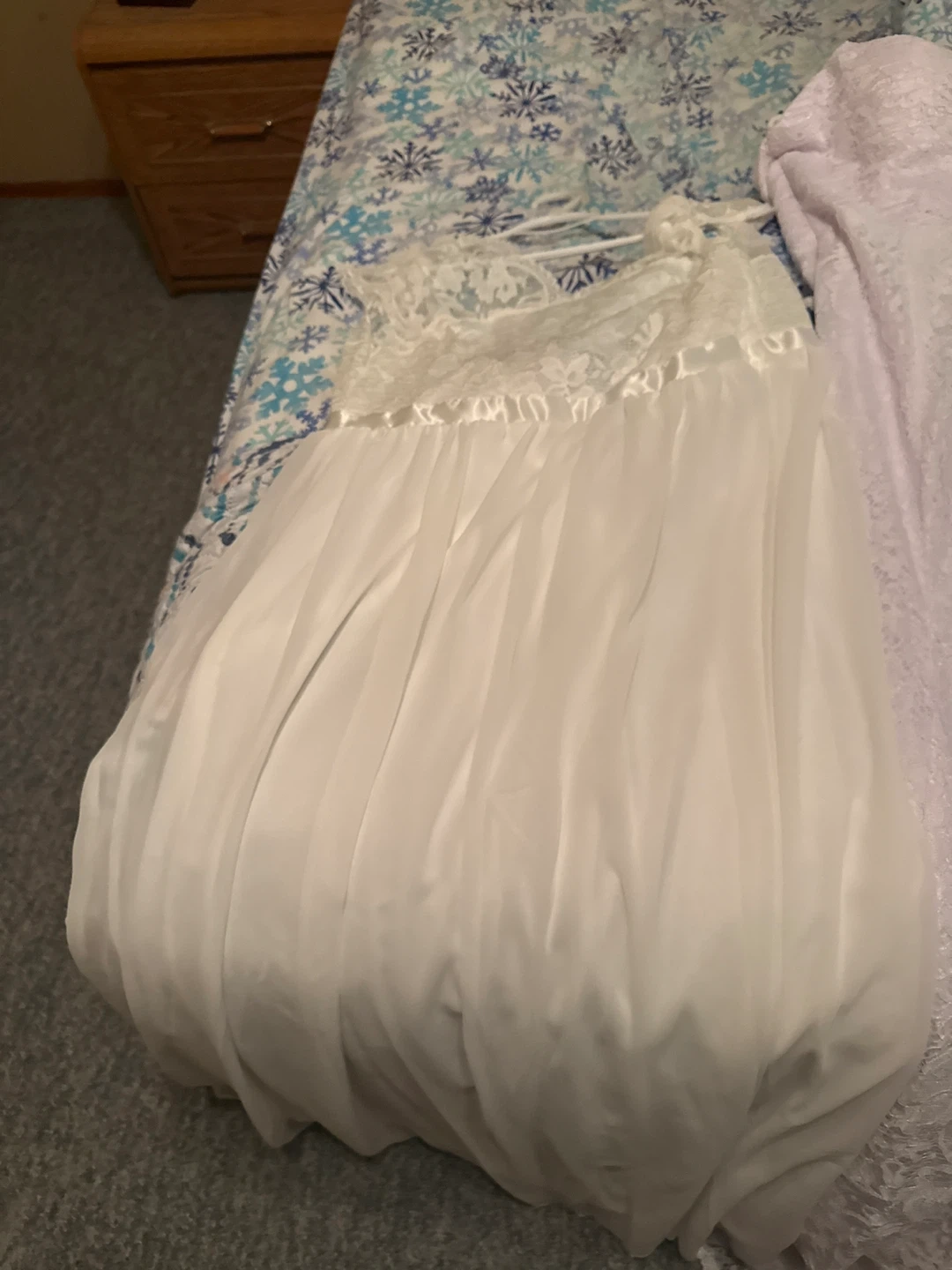White satin nightgown with lace trim details. It features adjustable straps. This is a lovely piece for a comfortable evening.