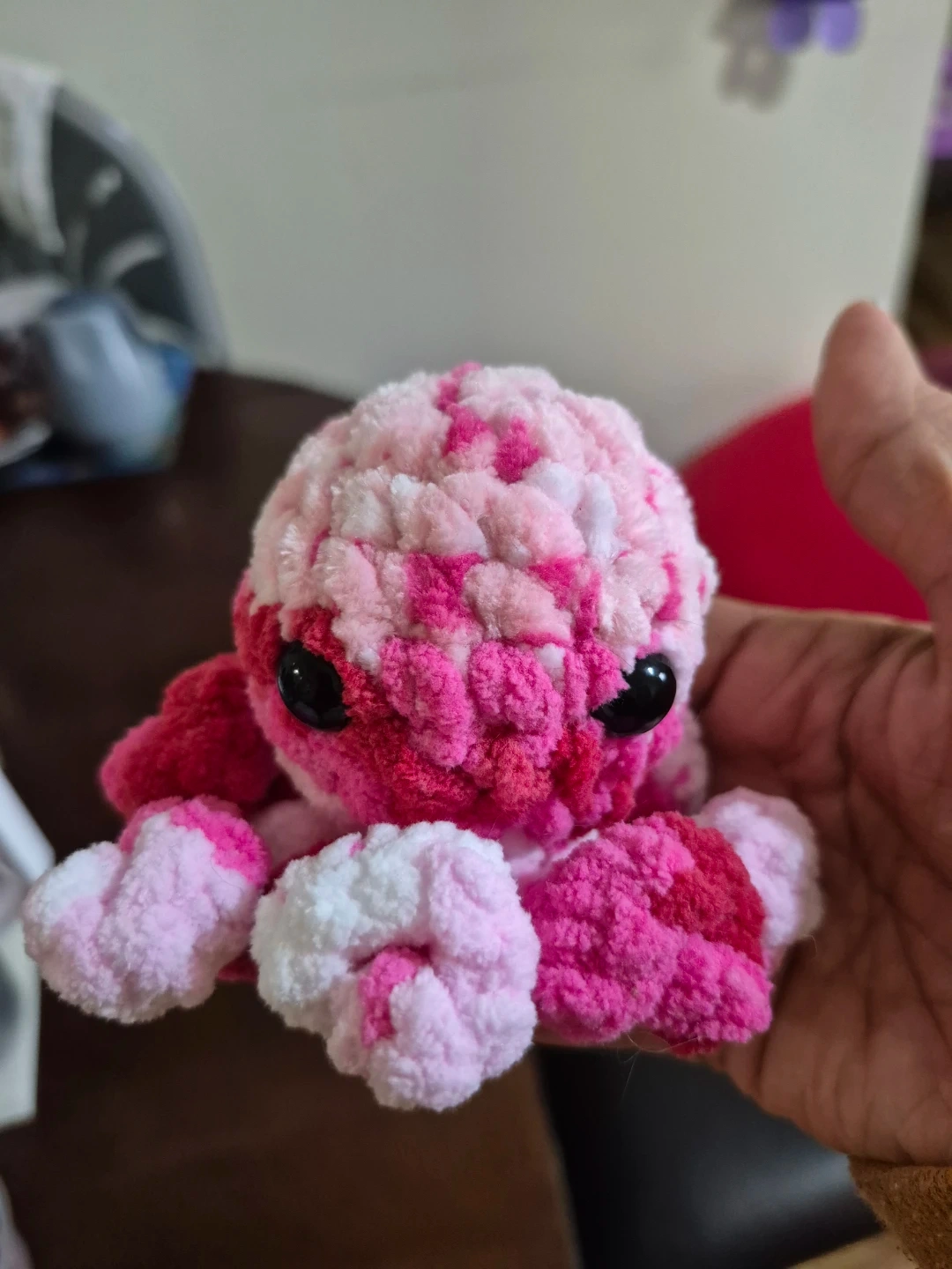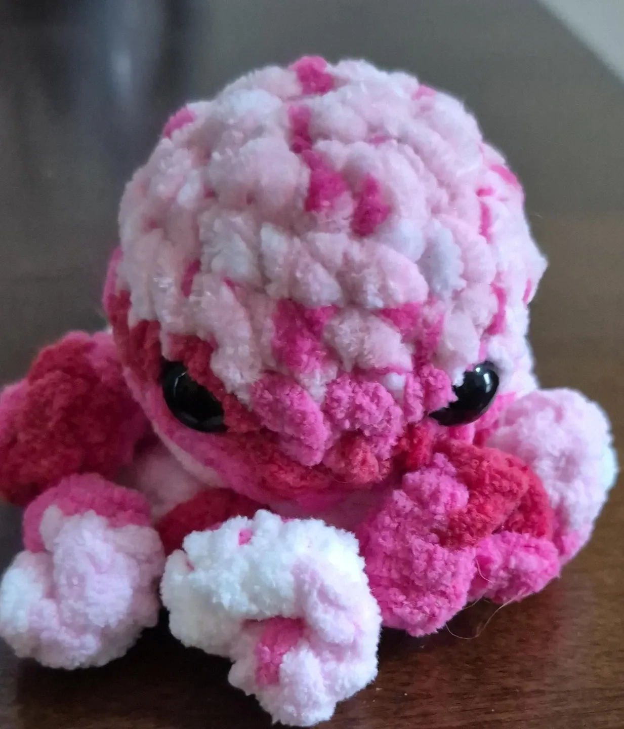 This is a cute, handmade crochet plush octopus toy. It's made with soft, pink and white marbled yarn and has black safety eyes. Approximately 4 inches tall and 5 inches wide, it's a great size for little hands to hold! Perfect for a nursery or as a gift.