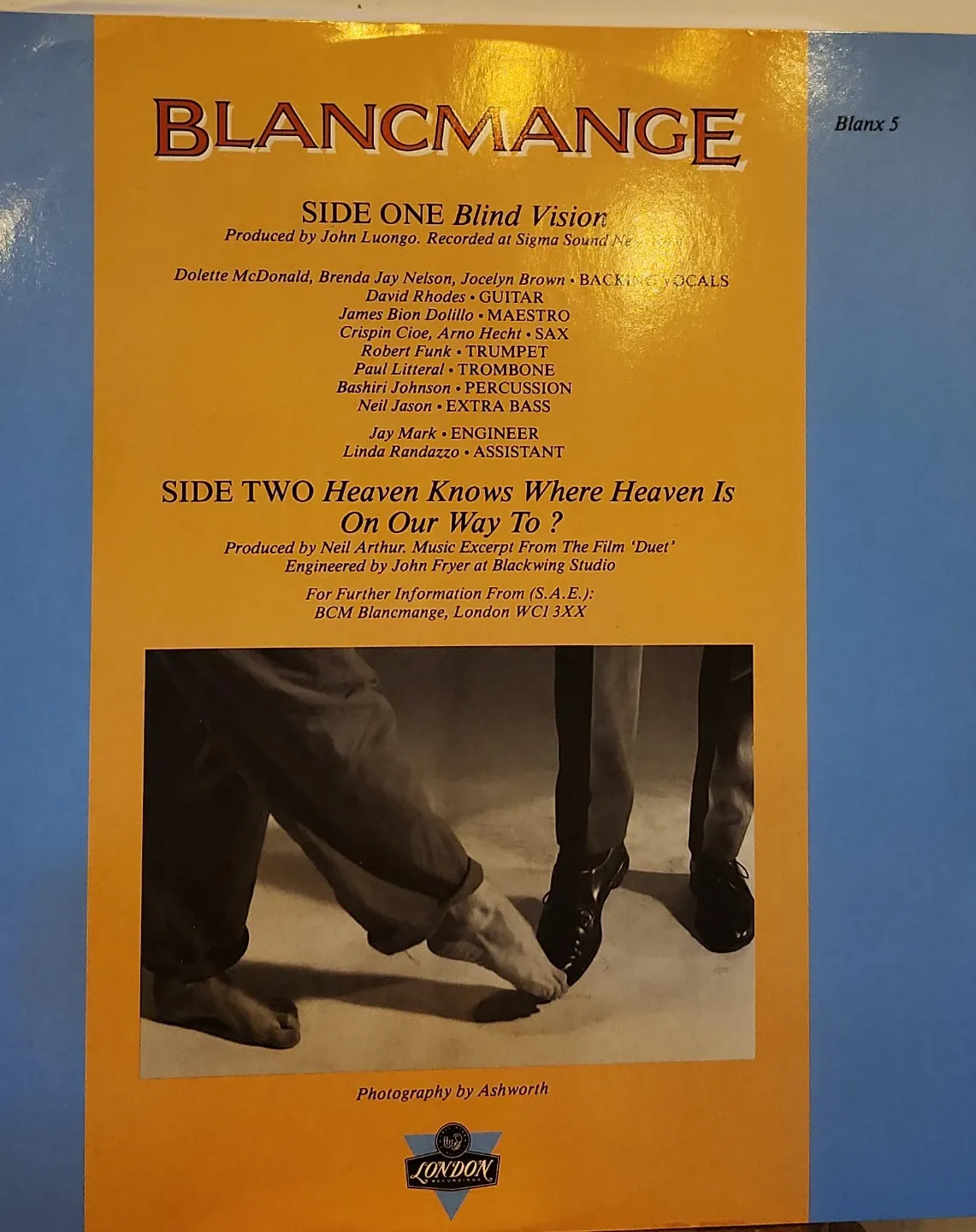 This is the Blancmange vinyl record featuring 'Blind Vision' on Side One and 'Heaven Knows Where Heaven Is On Our Way To?' on Side Two. It was recorded at Sigma Sound Ne and engineered by John Fryer at Blackwing Studio. The London Recordings label is visible. NO SKIPS!