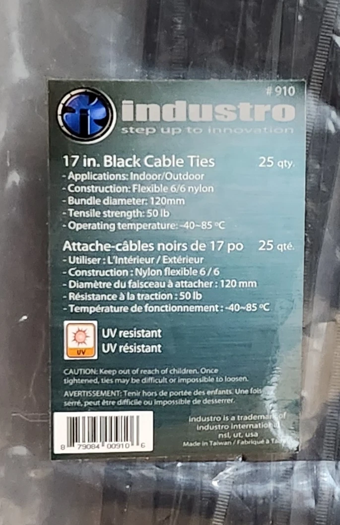 Industro 17-inch black cable ties. There are 25 in the pack. They are suitable for both indoor and outdoor use. They are made with flexible 6/6 nylon and are UV resistant