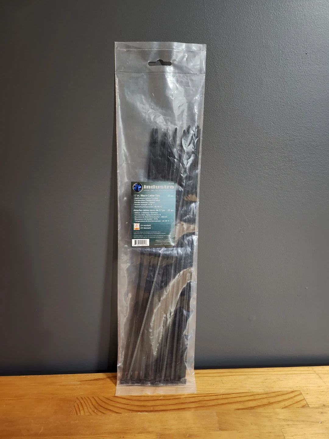 Industro 17-inch black cable ties. There are 25 in the pack. They are suitable for both indoor and outdoor use. They are made with flexible 6/6 nylon and are UV resistant